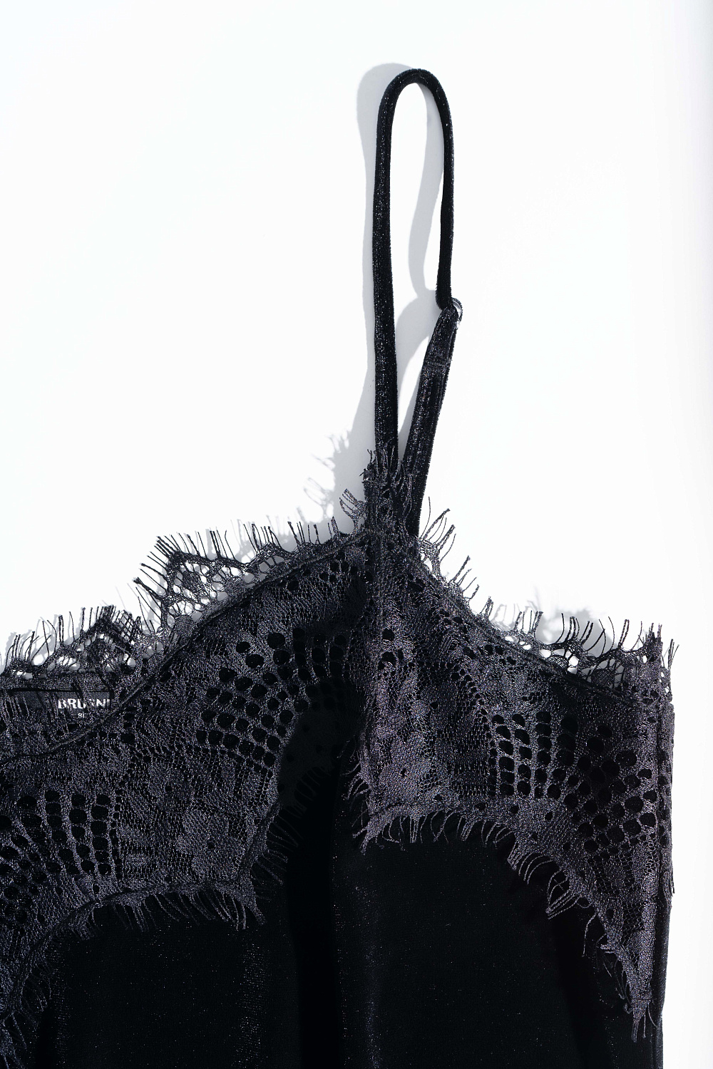 Top made of velvet viscose, decorated with thin lace. The model has an asymmetrical cut, with a deep neckline and thin straps.