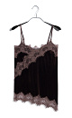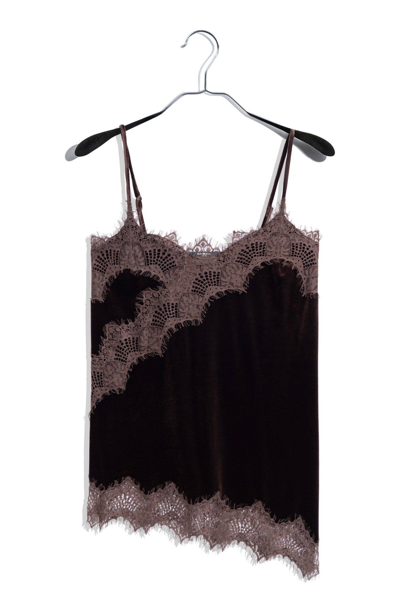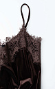 Top made of velvet viscose, decorated with thin lace. The model has an asymmetrical cut, with a deep neckline and thin straps.