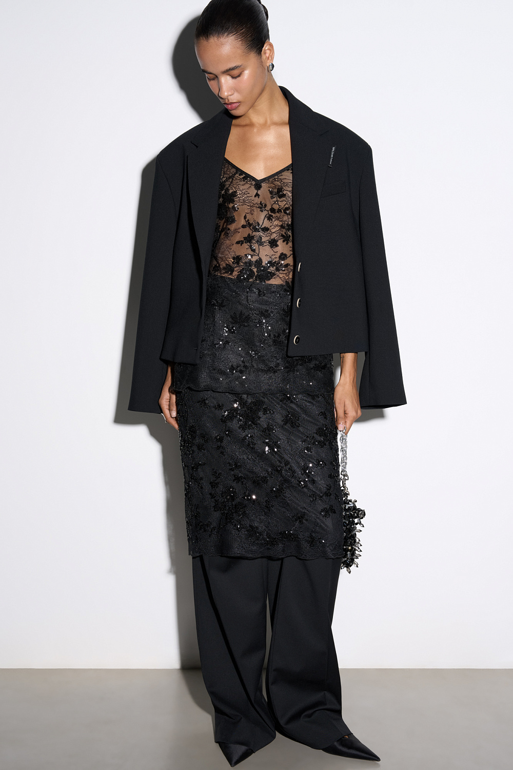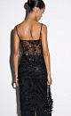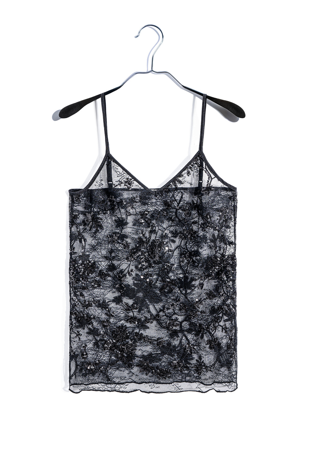 Lace top with floral patterns, embroidered with sequins. Loose silhouette model with thin adjustable straps.