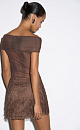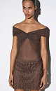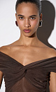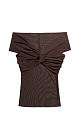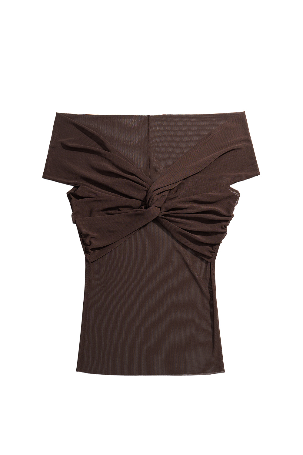 Semi-sheer top with open shoulders. Model of a fitted silhouette, sleeveless. The item is decorated with a twist on the chest and drapery on the bodice.
