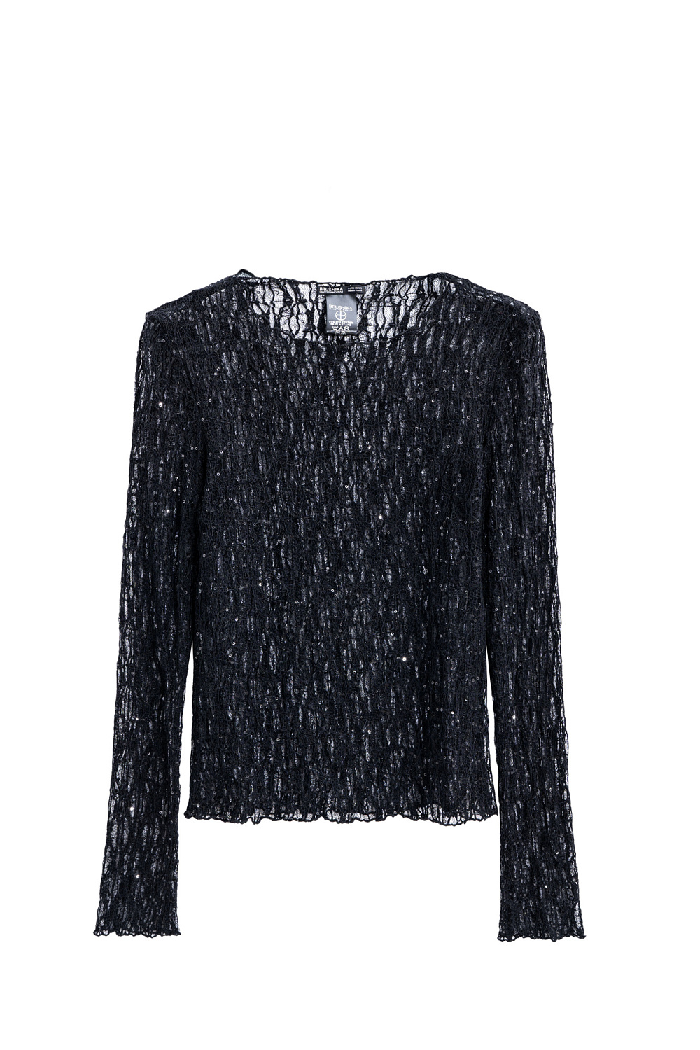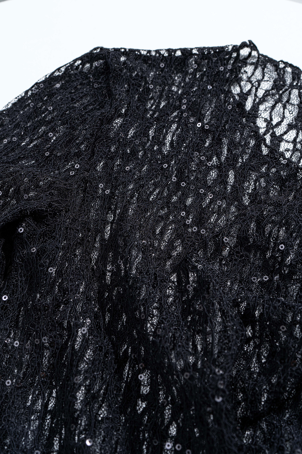 Lace long sleeve, decorated with sequins. Model with a boat neckline.