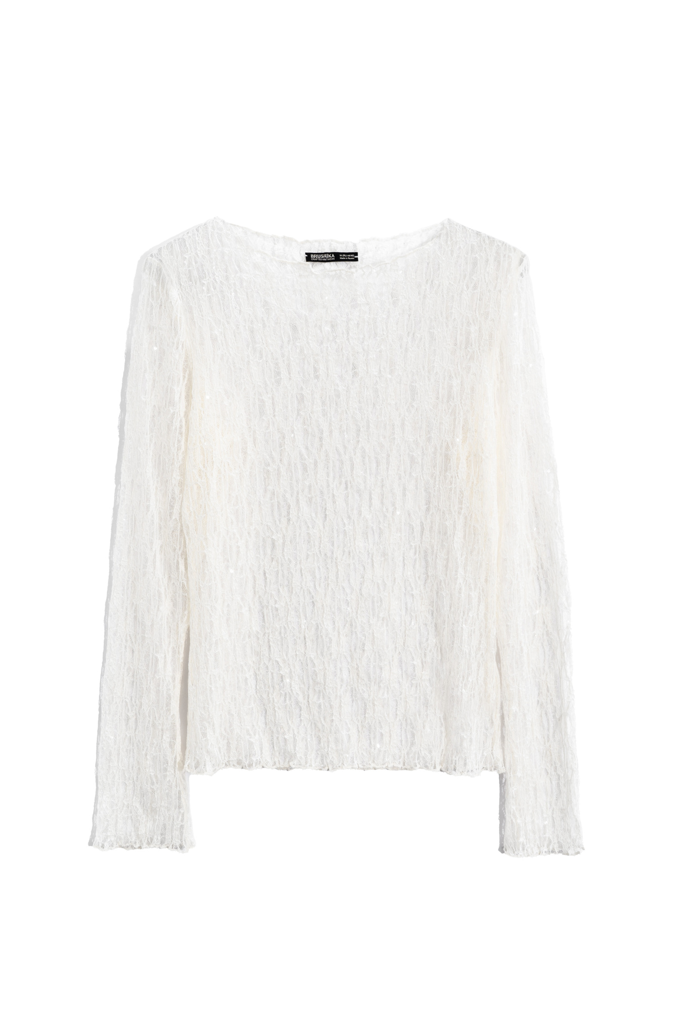 Lace long sleeve, decorated with sequins. Model with a boat neckline.