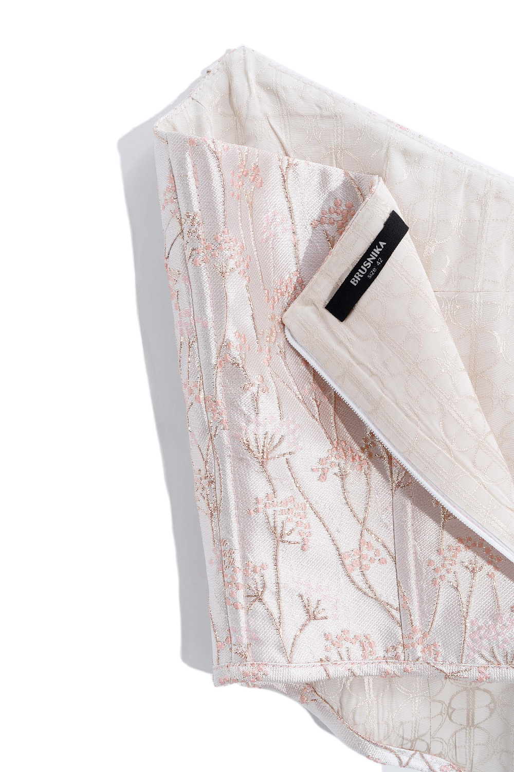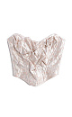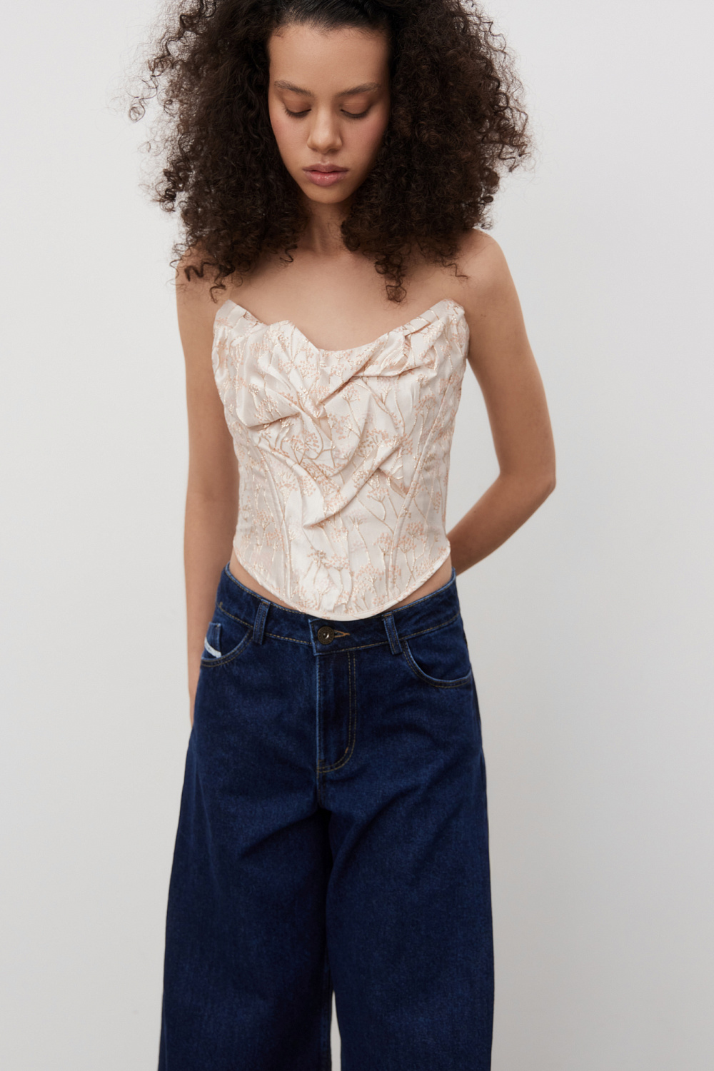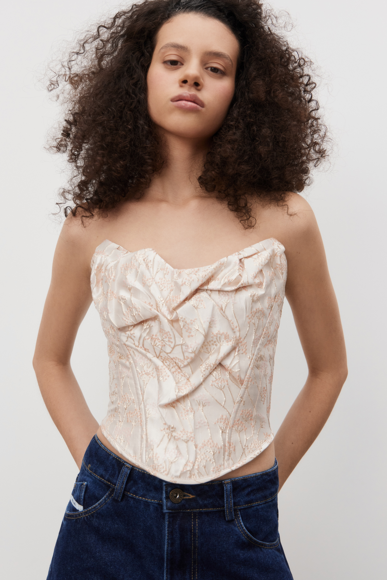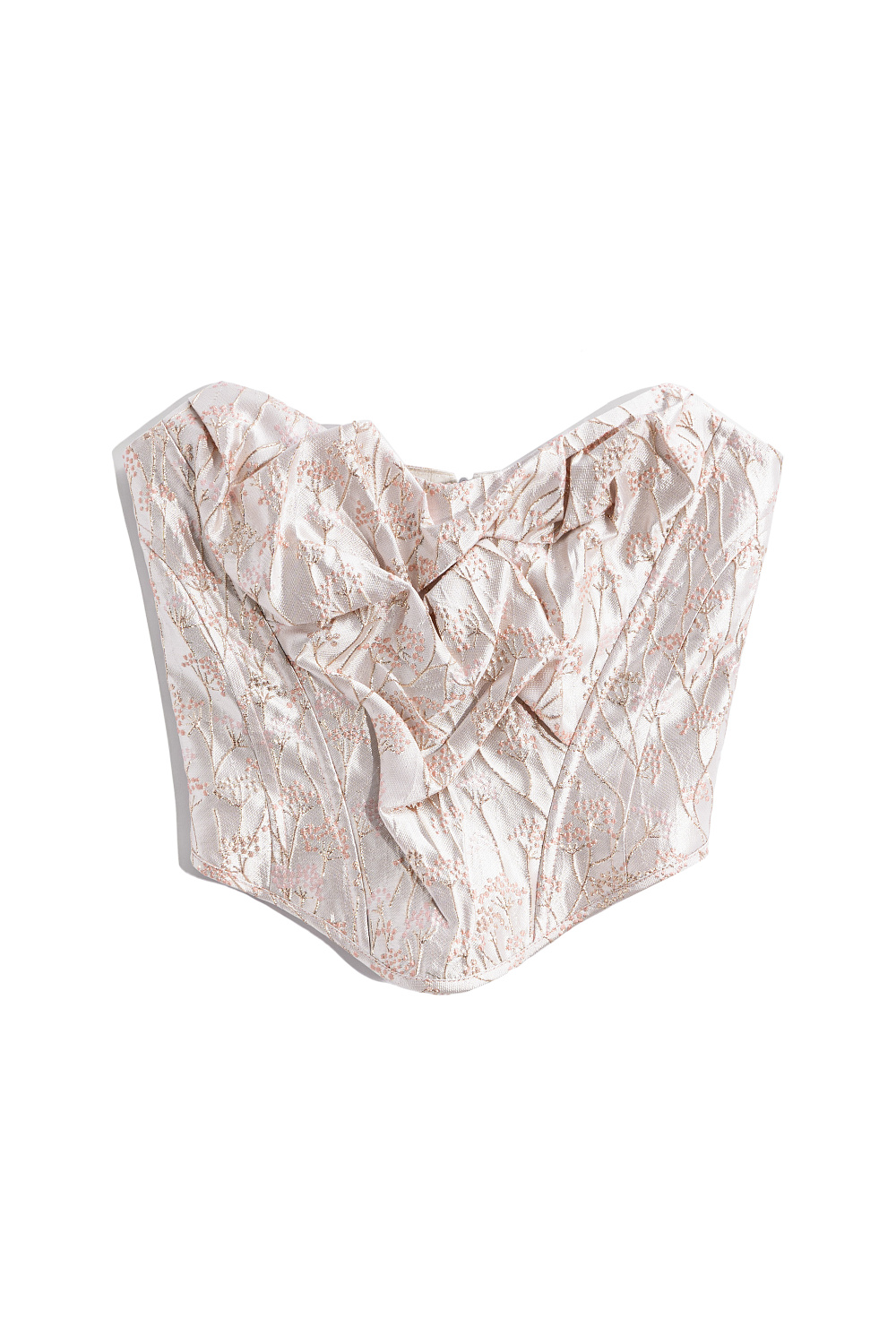 Corset made of crinkled jacquard with floral patterns. The model is strapless, with a figured neckline, drapery and voluminous decor. Zip fastening at the back.