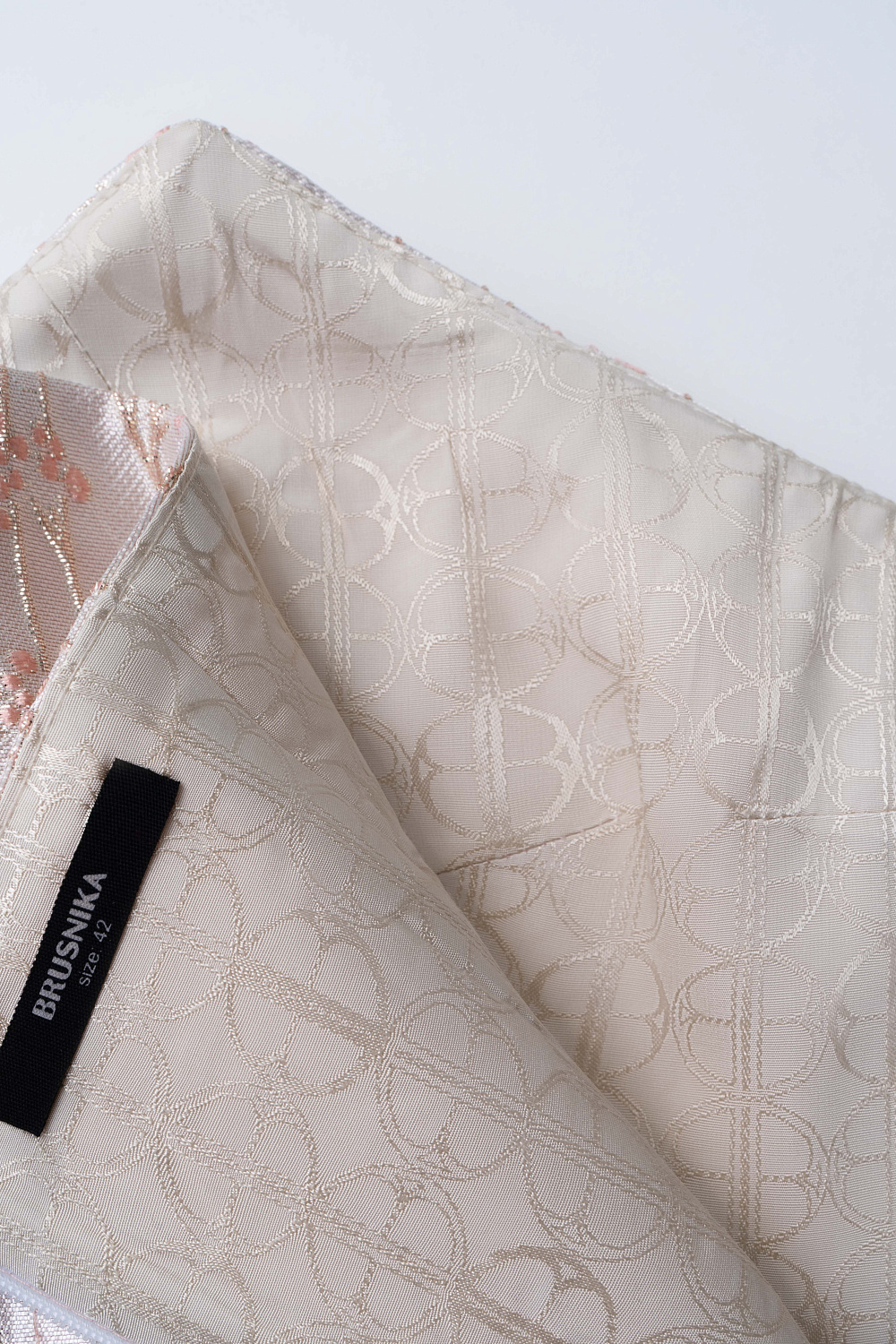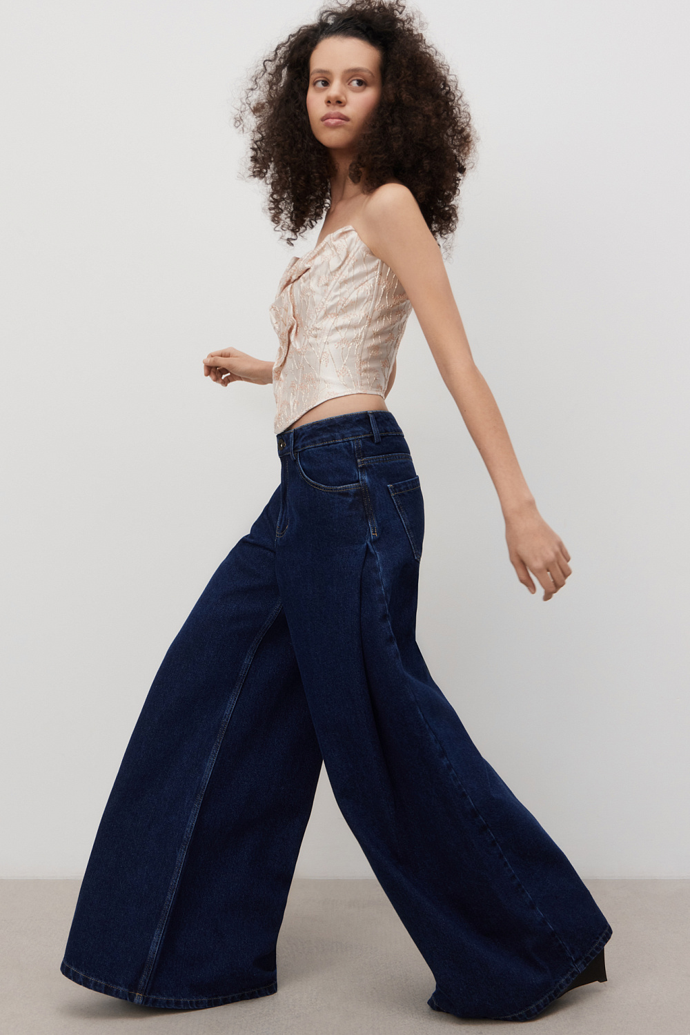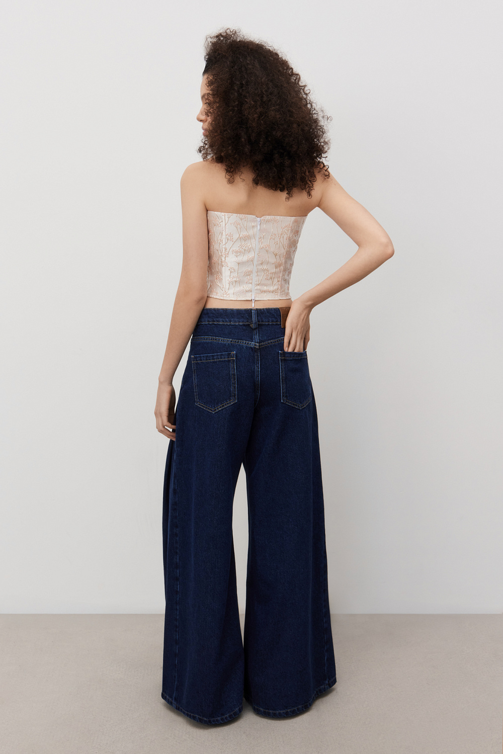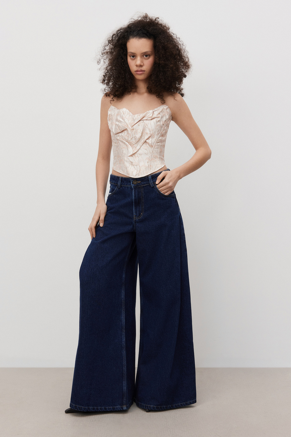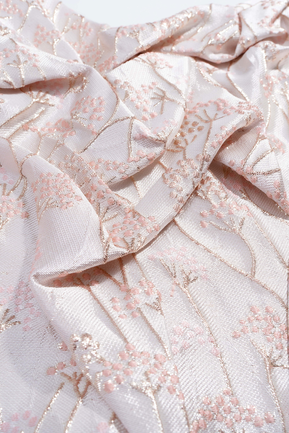 Corset made of crinkled jacquard with floral patterns. The model is strapless, with a figured neckline, drapery and voluminous decor. Zip fastening at the back.