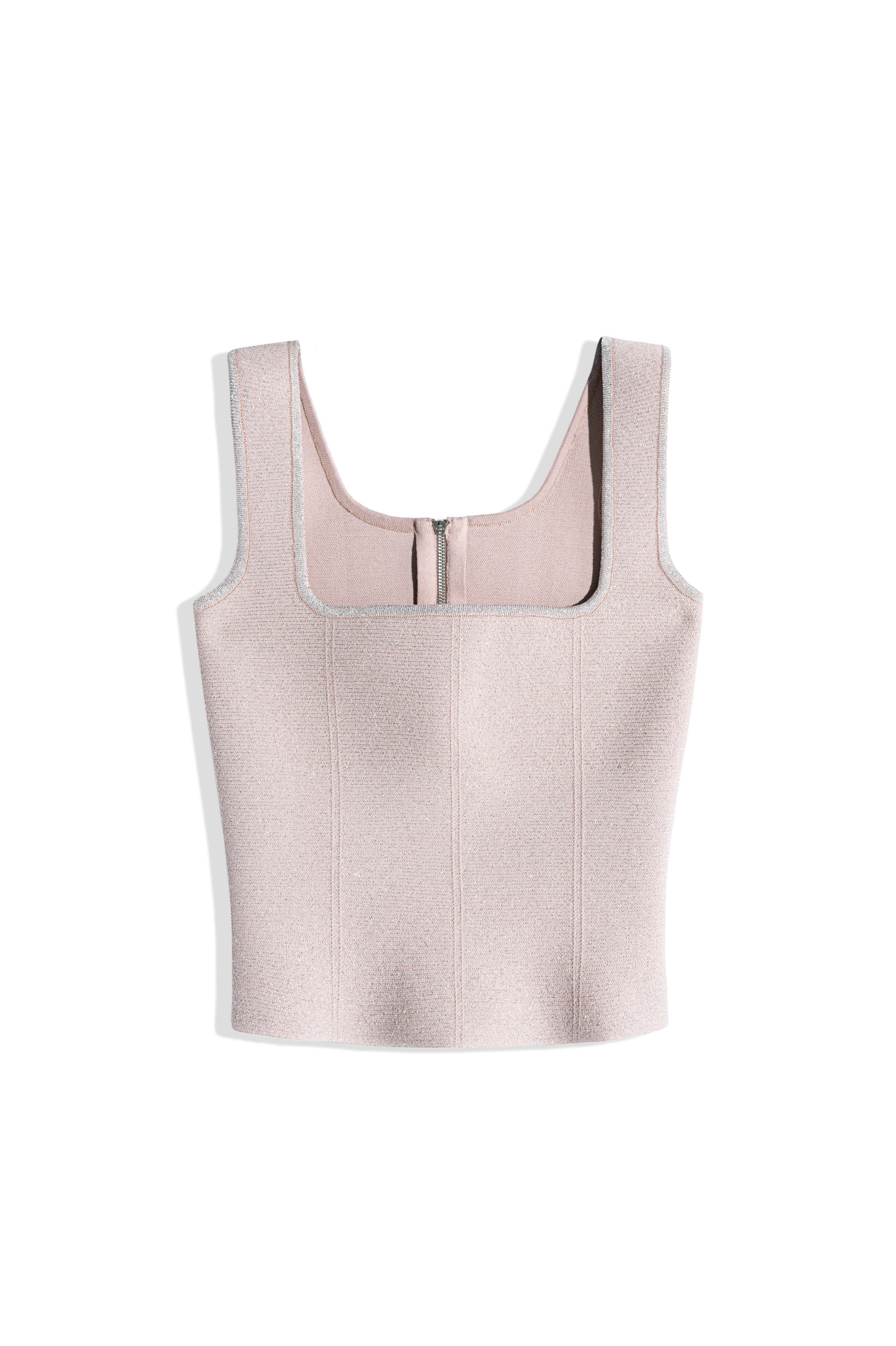 Short viscose knitted corset with luster. The model has a fitted silhouette, a square neckline and wide straps. It is fastened with a zipper at the back.
