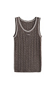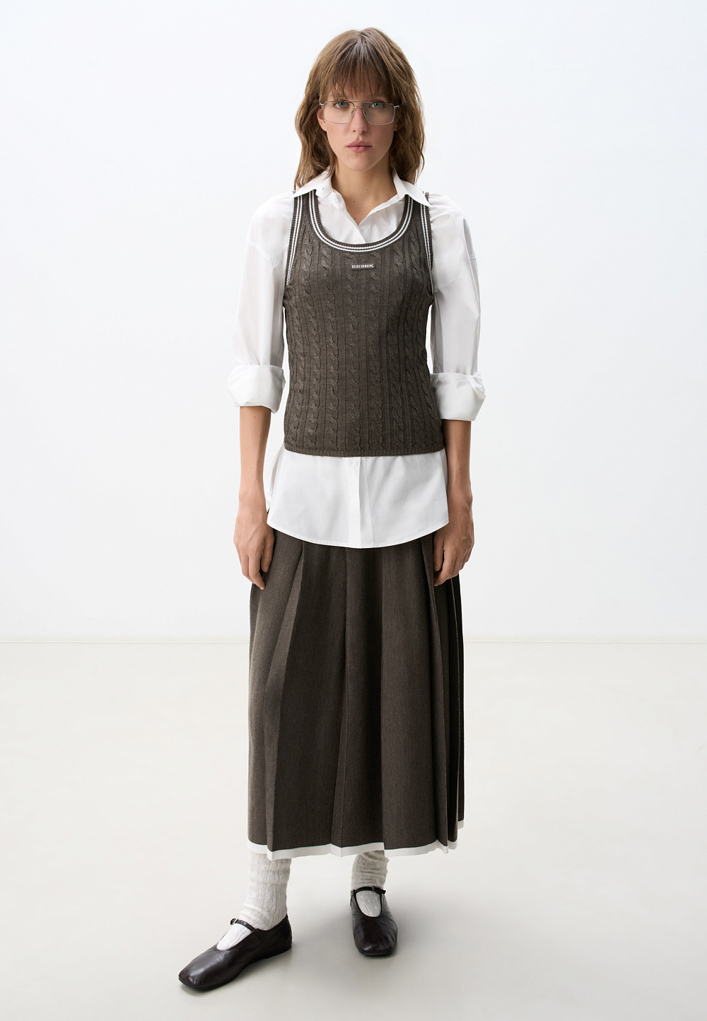 A knitted jersey made of wool. The model has a loose silhouette, is sleeveless, with wide straps, round neckline and deep armhole. The product is made of volumetric knitting with braids and decorated with a contrasting lash and a brand logo on the chest.