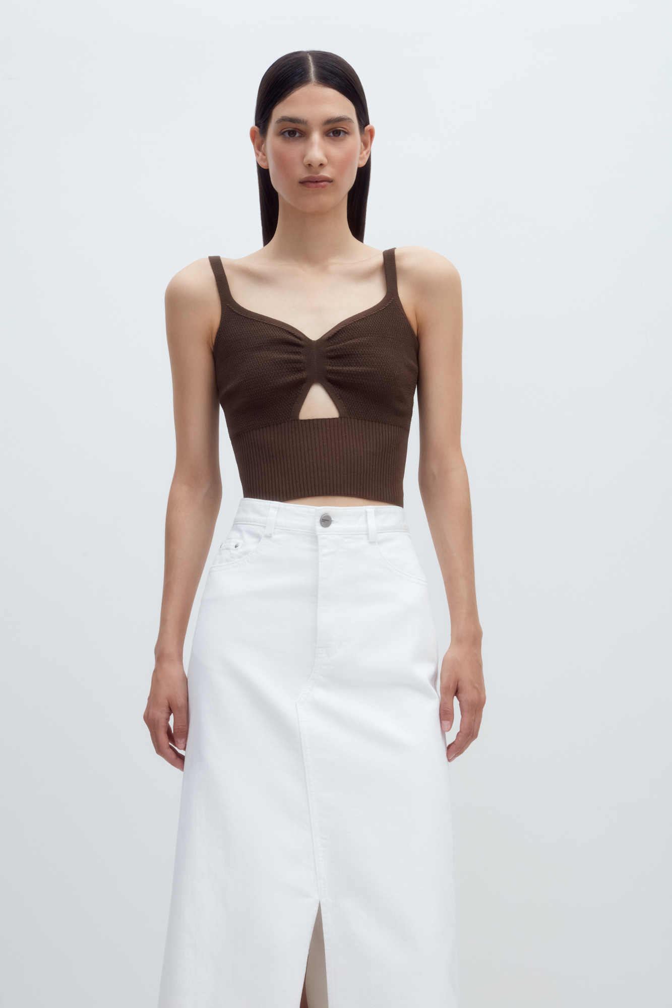 Knitted viscose сrop top with straps. Triangular cutout at front.