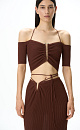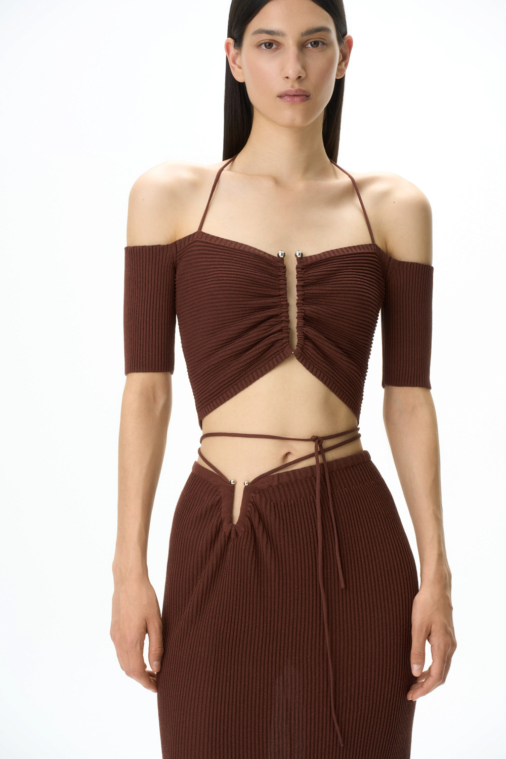 Metal detail knit crop top with short sleeves. Pairs perfectly with a skirt.