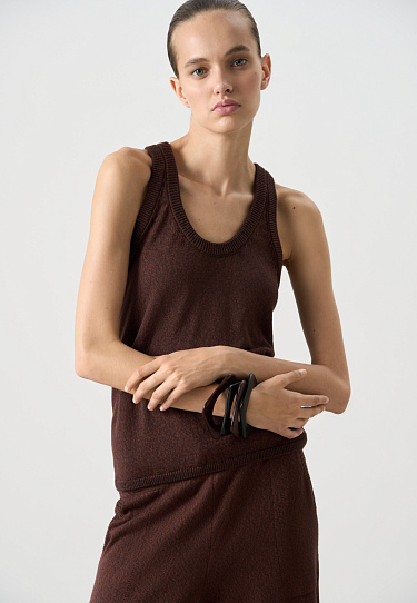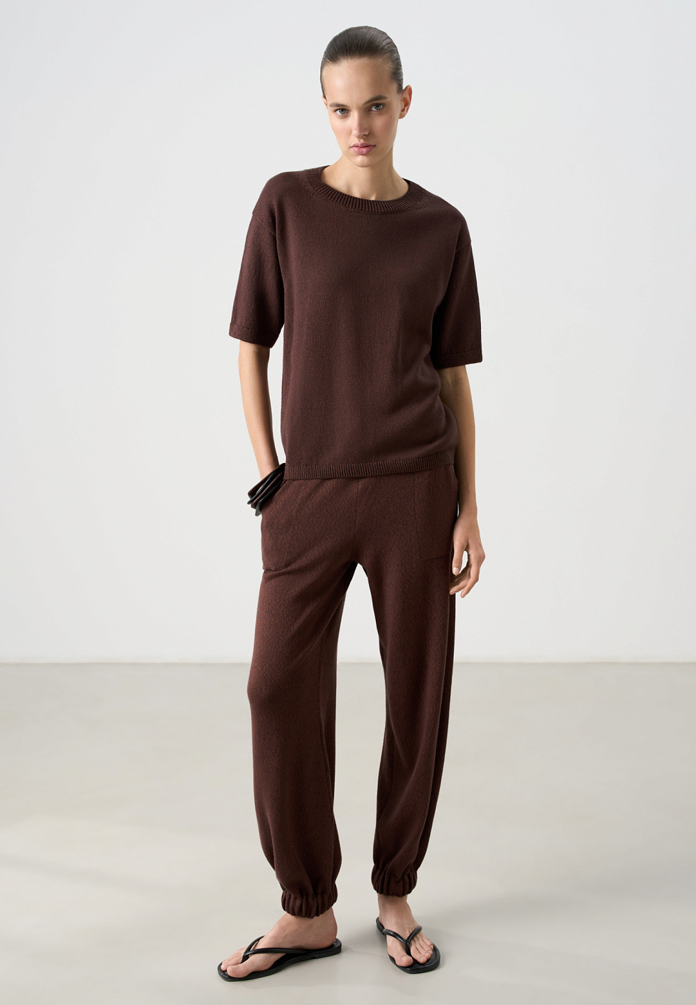 Knitted jogging trousers made of cotton with added viscose. The model is made in a sporty style, with a wide elastic waistband with a drawstring, side pockets and wide cuffs with elastic.