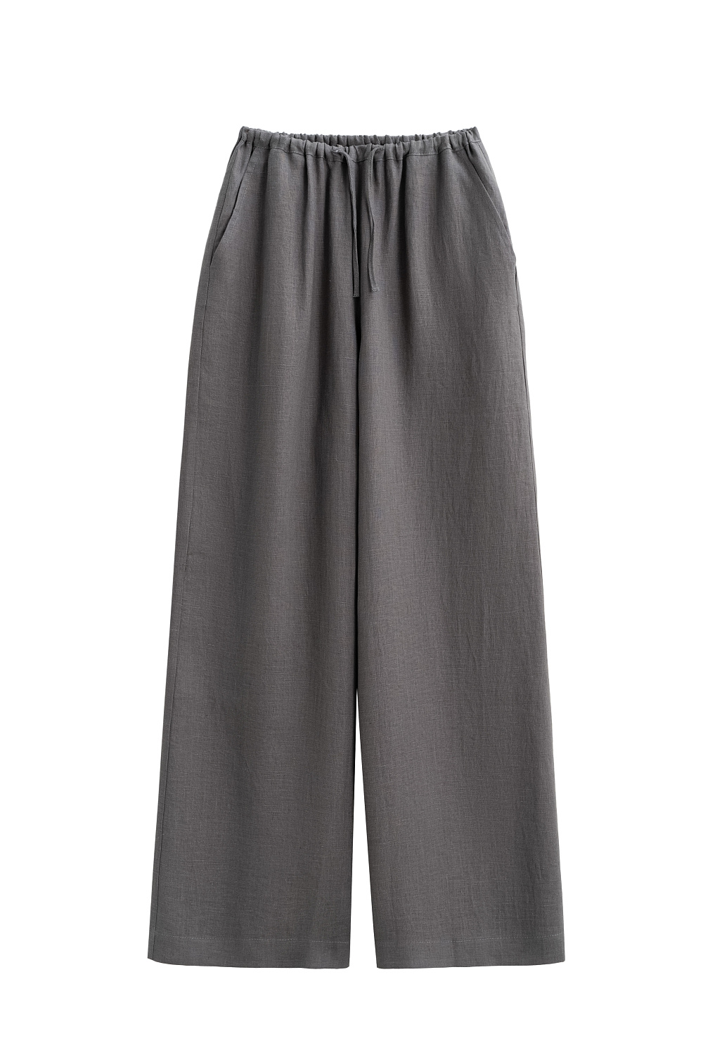 Wide trousers made of 100% linen. The model has a loose straight cut with slit pockets on the sides. The product is made with a belt with a narrow elastic band, complemented by a drawstring.