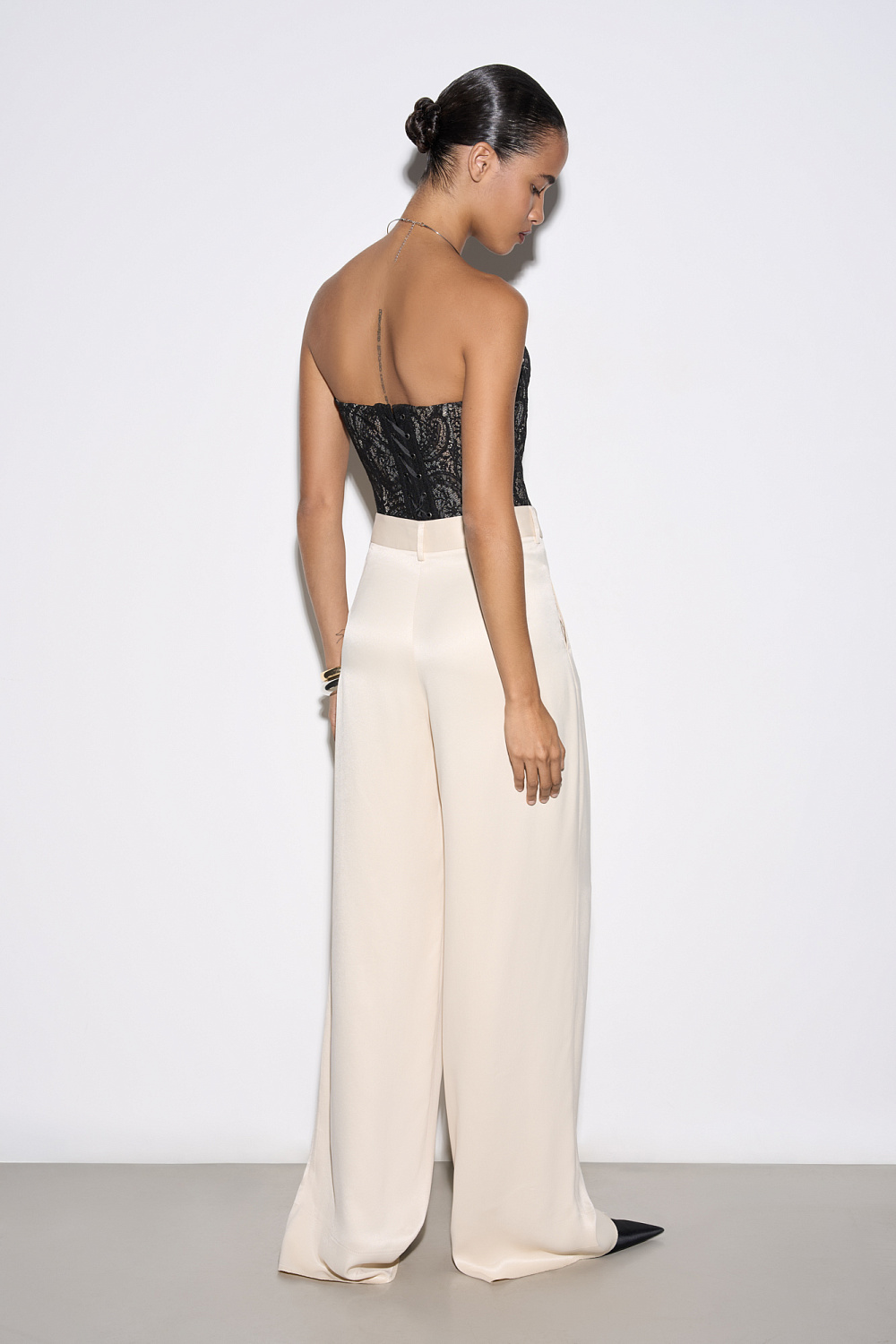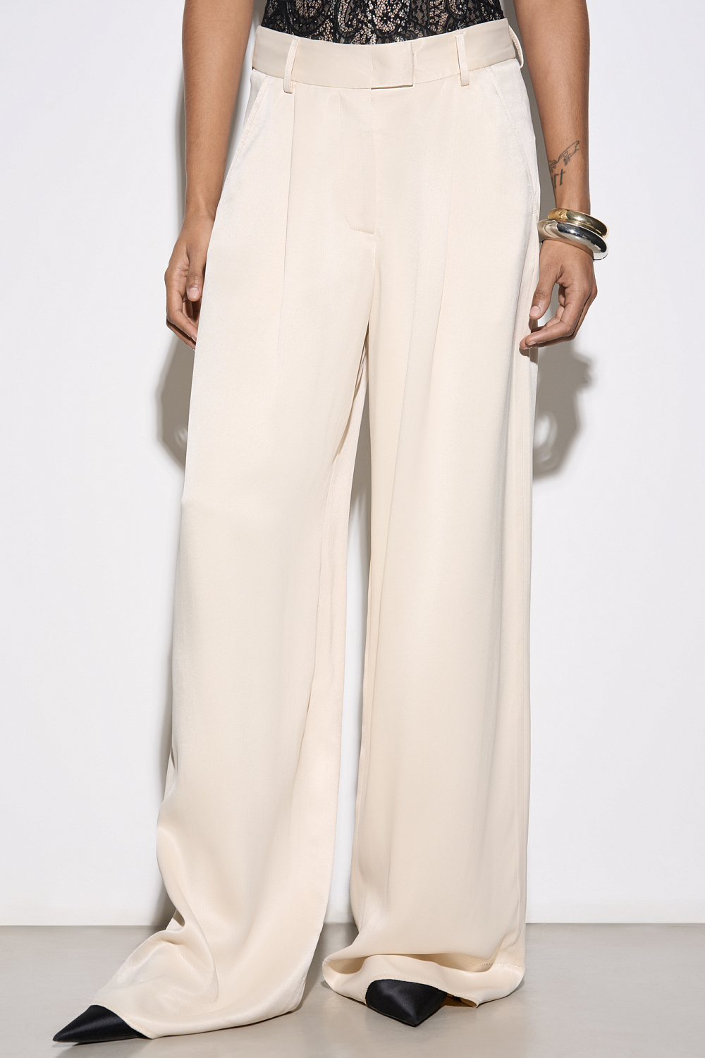 Satin trousers made of 100% viscose. Straight fit model with belt loops, pockets and zip fastening, trouser hook and button.