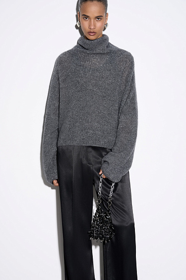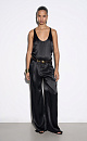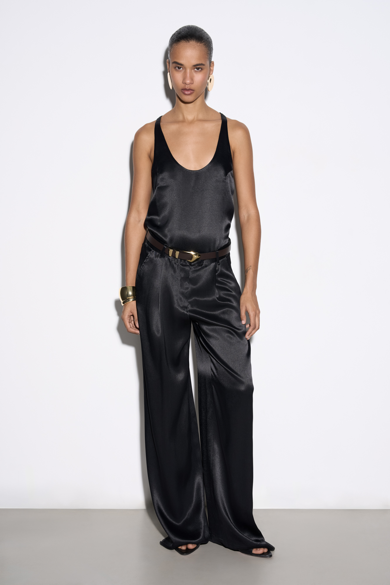 Satin trousers made of 100% viscose. Straight fit model with belt loops, pockets and zip fastening, trouser hook and button.