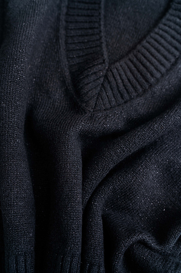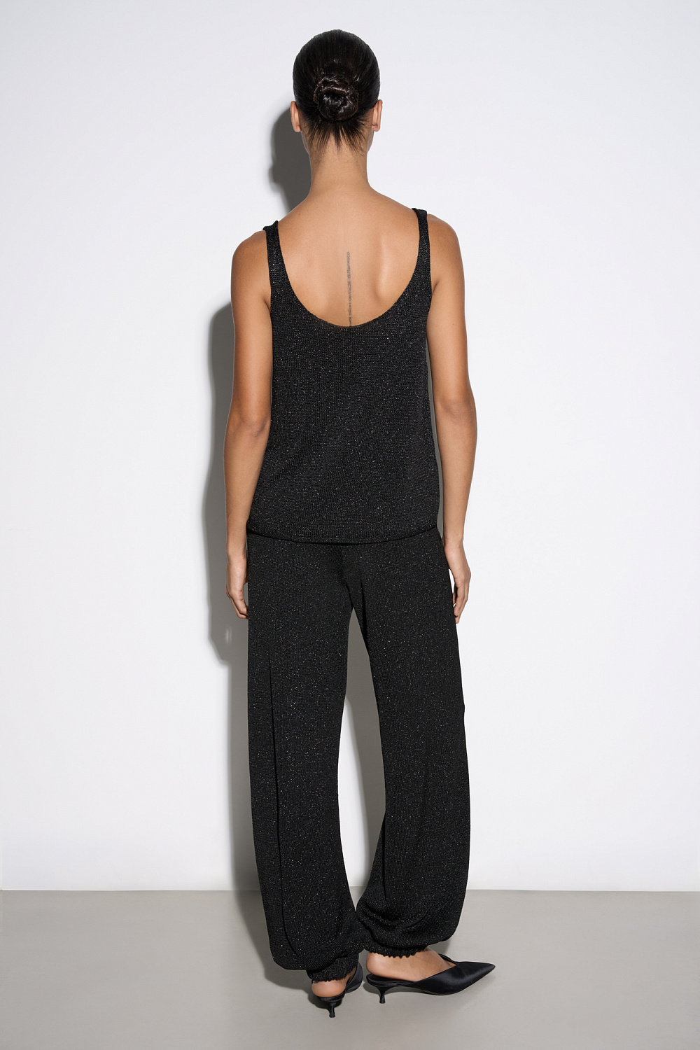 Knitted jogging trousers made of viscose with the addition of lurex. Model with an elastic waistband with a drawstring, side pockets and elasticated cuffs.