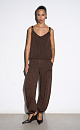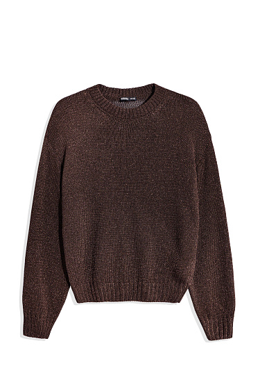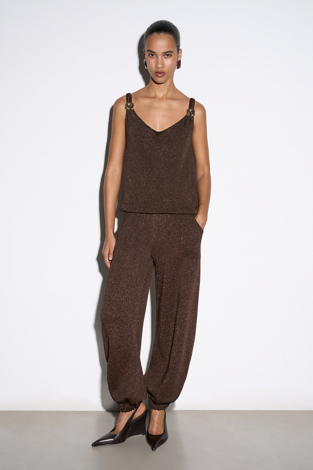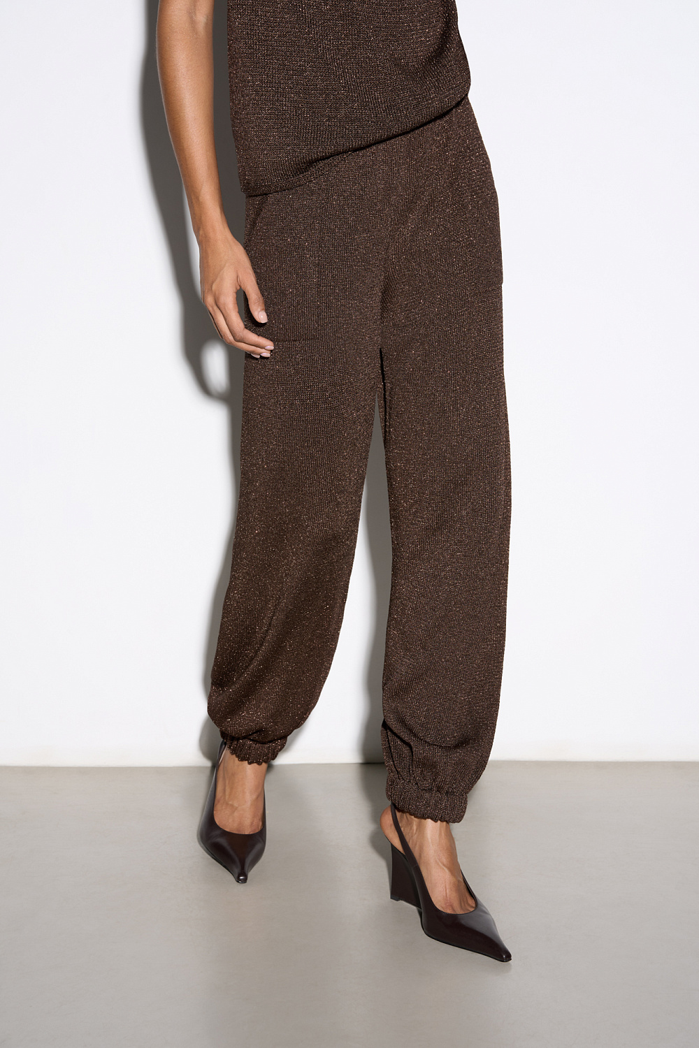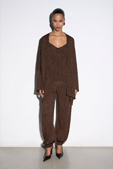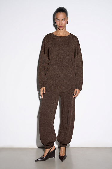 Knitted jogging trousers made of viscose with the addition of lurex. Model with an elastic waistband with a drawstring, side pockets and elasticated cuffs.