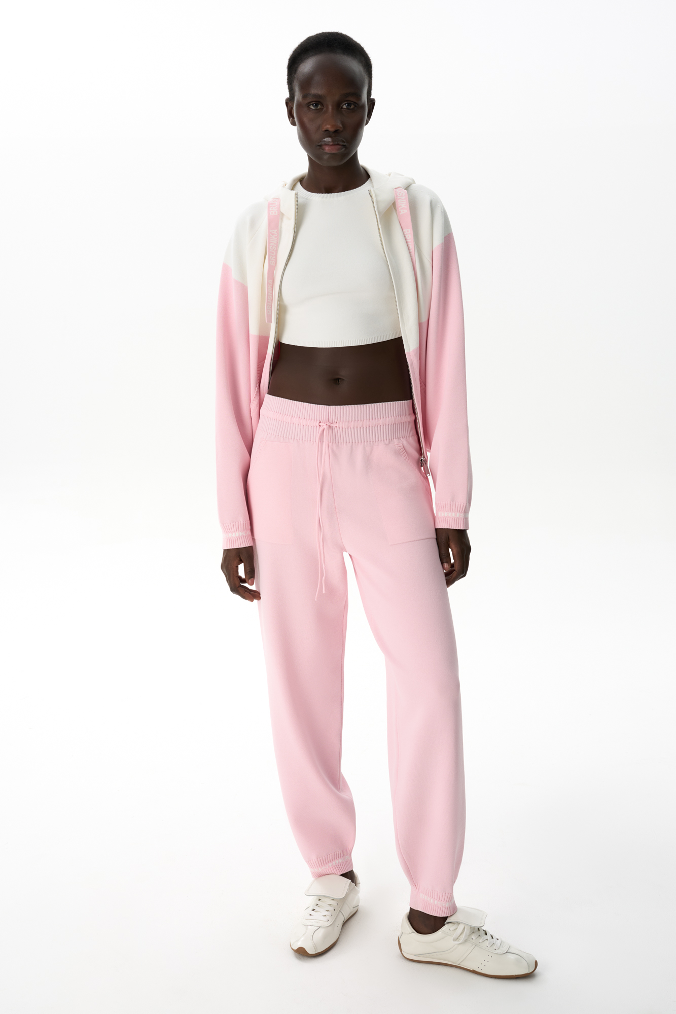 Viscose sweatpants with pockets. Model with a wide elastic waistband with a drawstring and elasticated cuffs.