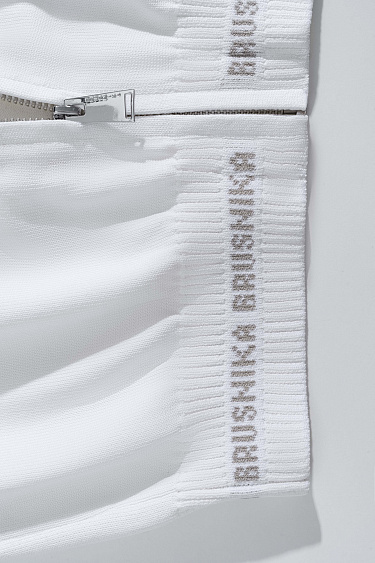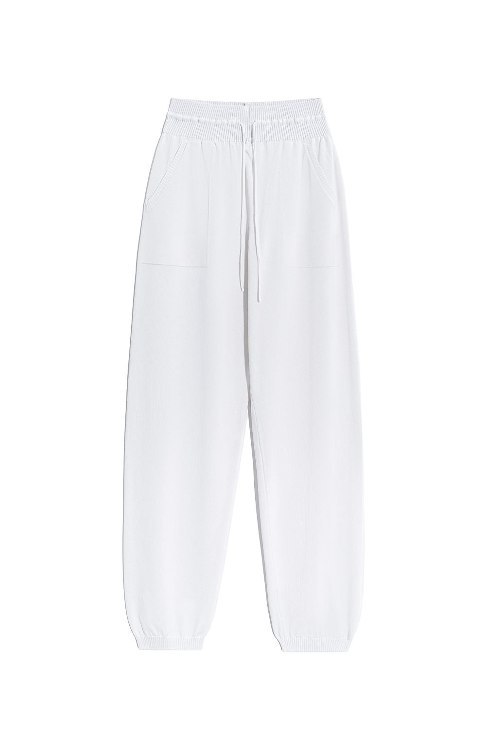 Knitted viscose trousers with side pockets. Elastic waistband with drawstring and ribbed cuffs.