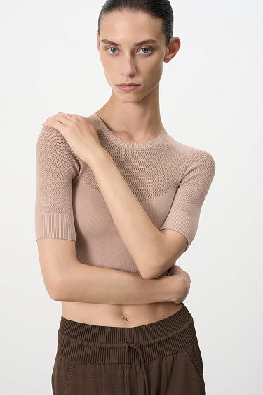 Knitted viscose trousers with side pockets. Elastic waistband with drawstring and ribbed cuffs.