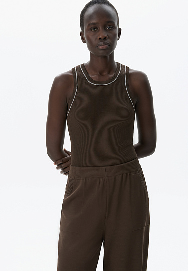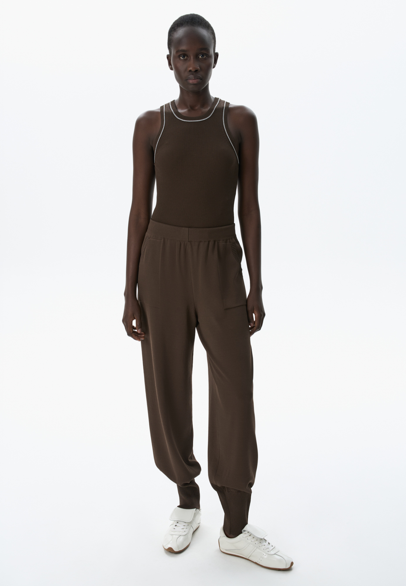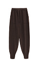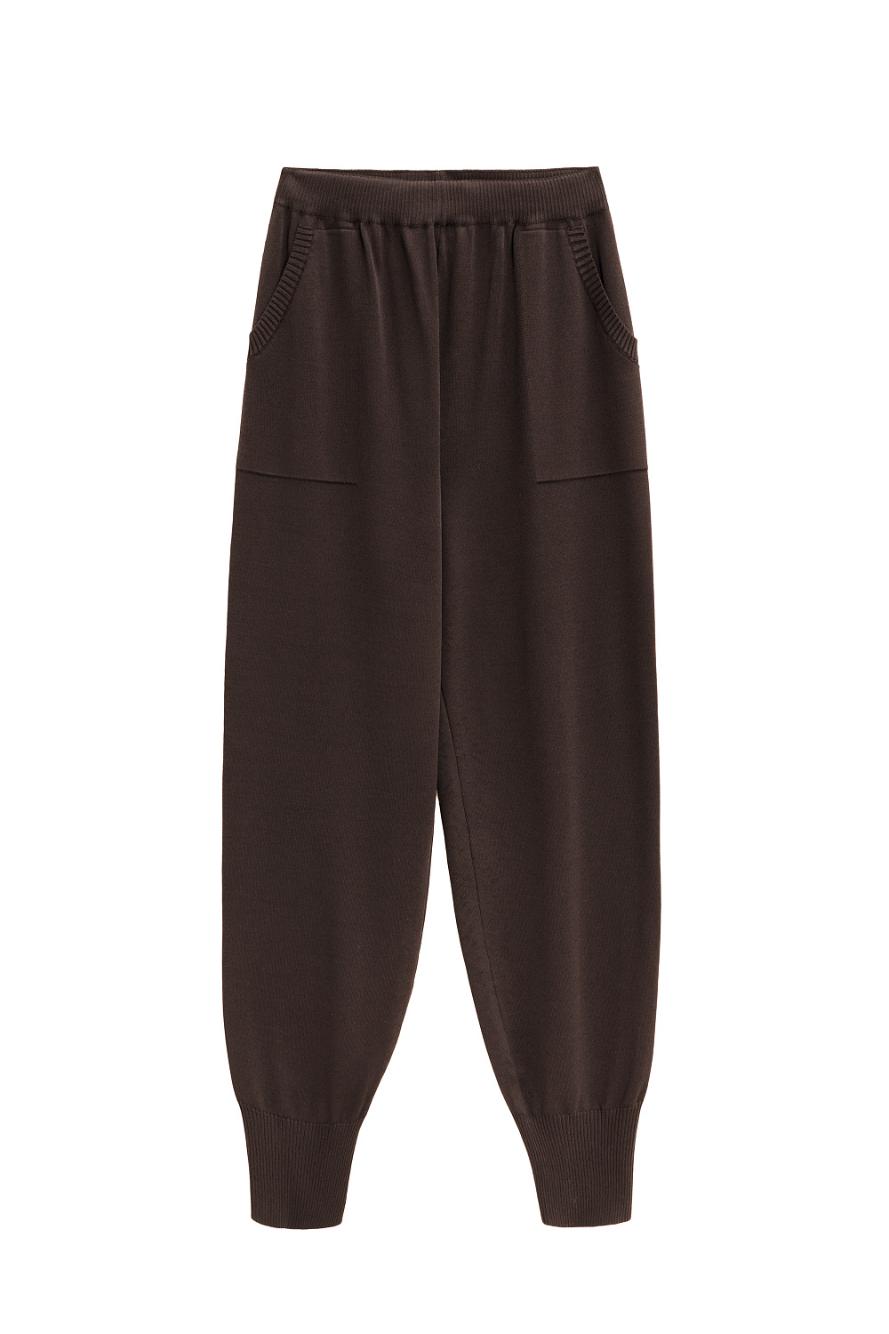 Knitted trousers made of thick viscose in a sporty style. Adjustable drawstring waistband. Side pockets. Elastic cuffs.