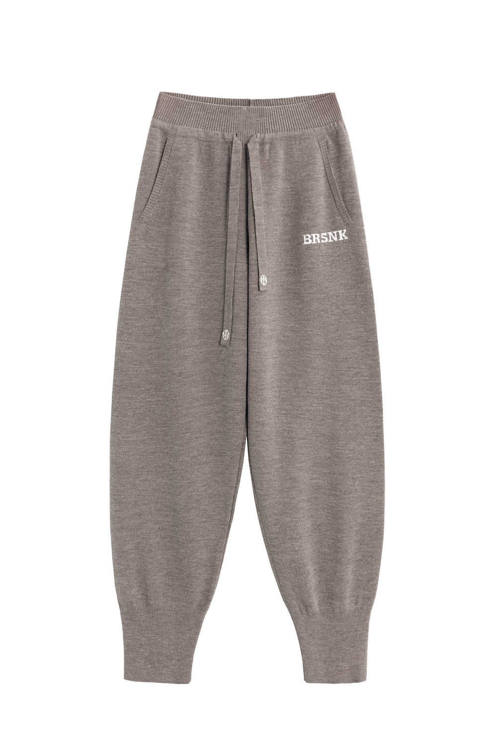 Knitted trousers made of wool with the addition of acrylic. The model is made in a sporty style, with a wide elastic waistband with a drawstring, side pockets and wide cuffs with elastic. The product is decorated with branded jacquard on the leg.
