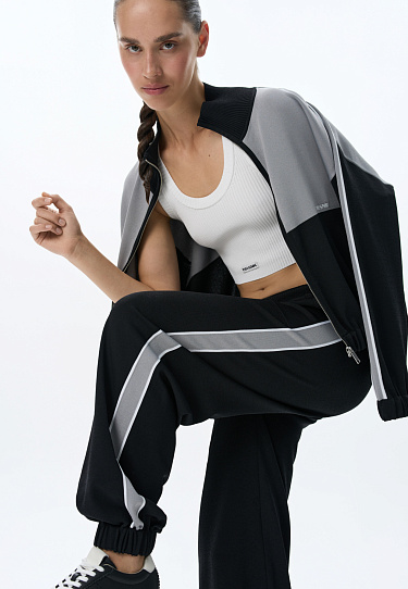 Knitted viscose jogging trousers. The model is made in a sporty style, with an elastic waistband with a drawstring, side pockets and elasticated cuffs. The product is decorated with wide stripes of contrasting color.