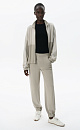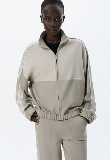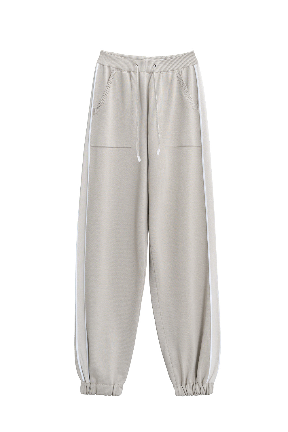 Knitted viscose jogging trousers. The model is made in a sporty style, with an elastic waistband with a drawstring, side pockets and elasticated cuffs. The product is decorated with wide stripes of contrasting color.