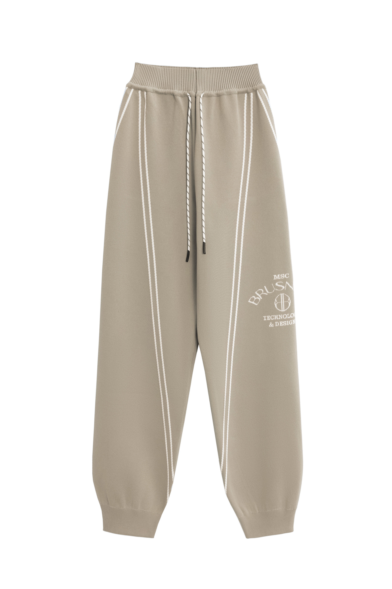 Knitted viscose joggers. The model has a loose silhouette, with a wide elastic waistband with a drawstring, side and back pockets. The product is decorated with branded jacquard and stripes in a contrasting color.