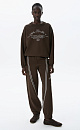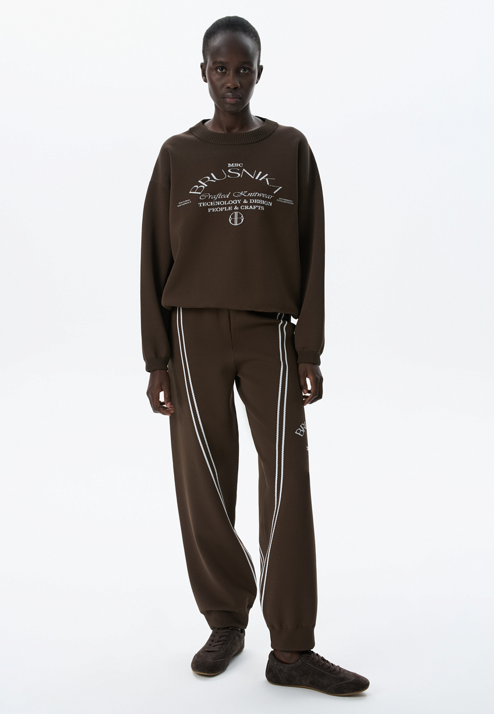 Knitted viscose joggers. The model has a loose silhouette, with a wide elastic waistband with a drawstring, side and back pockets. The product is decorated with branded jacquard and stripes in a contrasting color.