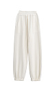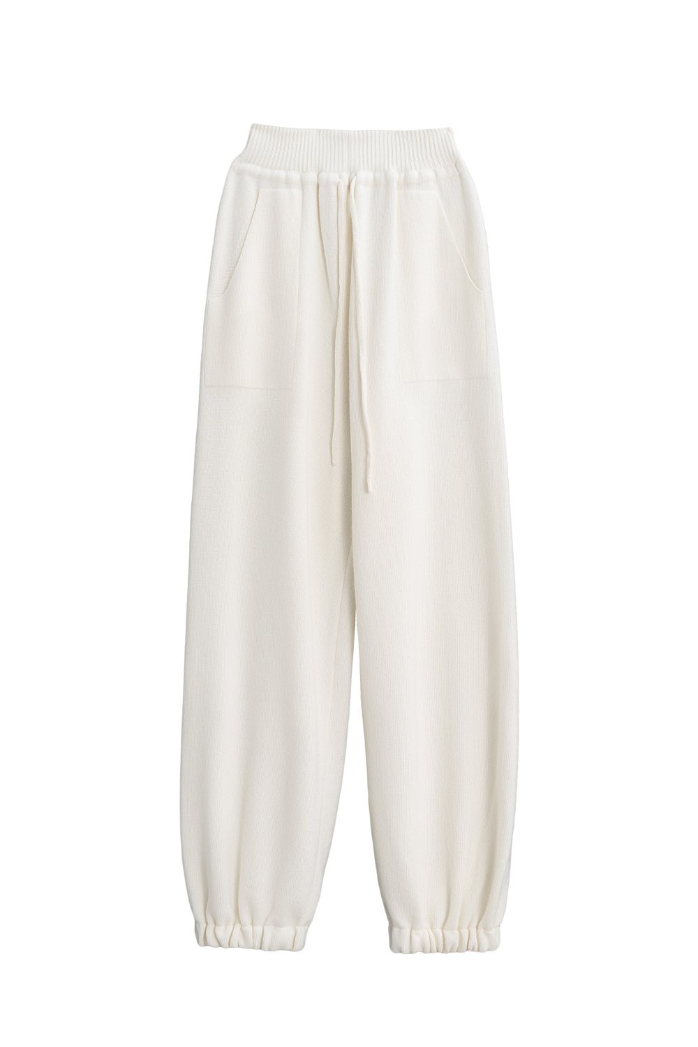 Knitted banana trousers made of cashmere and wool. The model has a loose silhouette, with an elastic ribbed waistband, complemented by a drawstring, and two large pockets. The cuffs are made with elastic bands.
