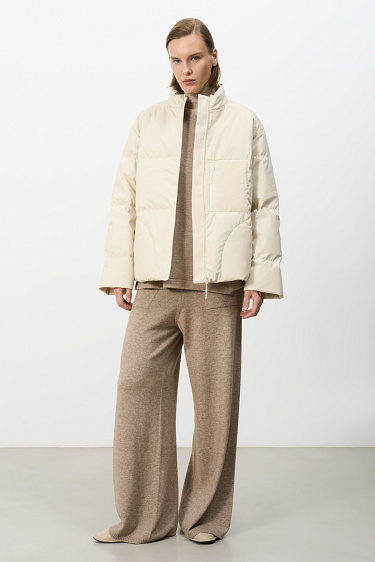 Knitted banana trousers made of cashmere and wool. The model has a loose silhouette, with an elastic ribbed waistband, complemented by a drawstring, and two large pockets. The cuffs are made with elastic bands.