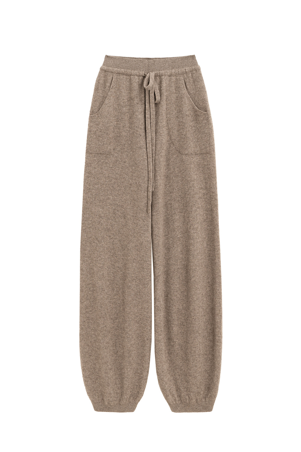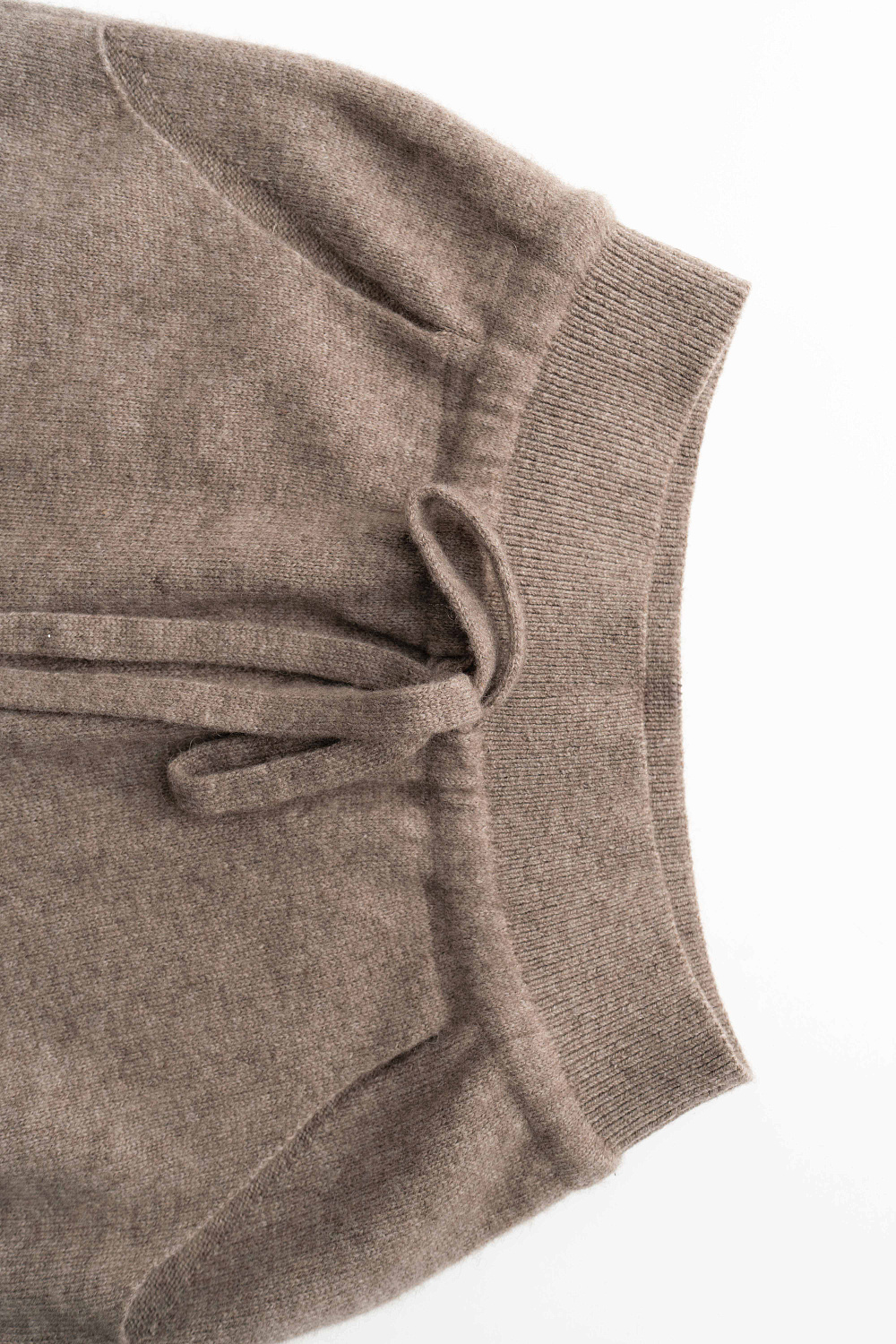 Knitted trousers made of extrafine yak and merino wool. Model with elastic waistband and round pockets. The trouser cuffs and belt are ribbed.