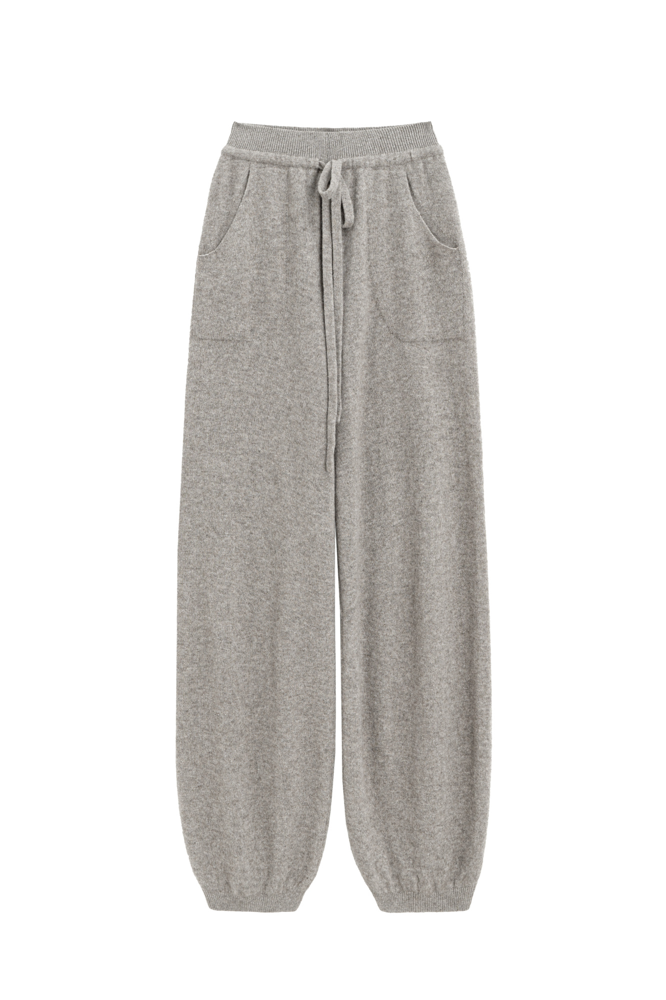 Knitted trousers made of extrafine yak and merino wool. Model with elastic waistband and round pockets. The trouser cuffs and belt are ribbed.