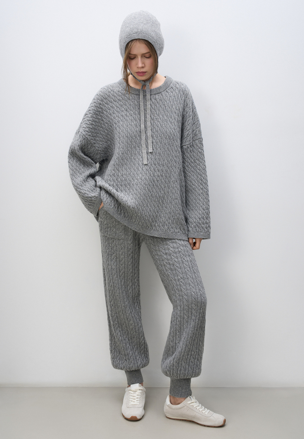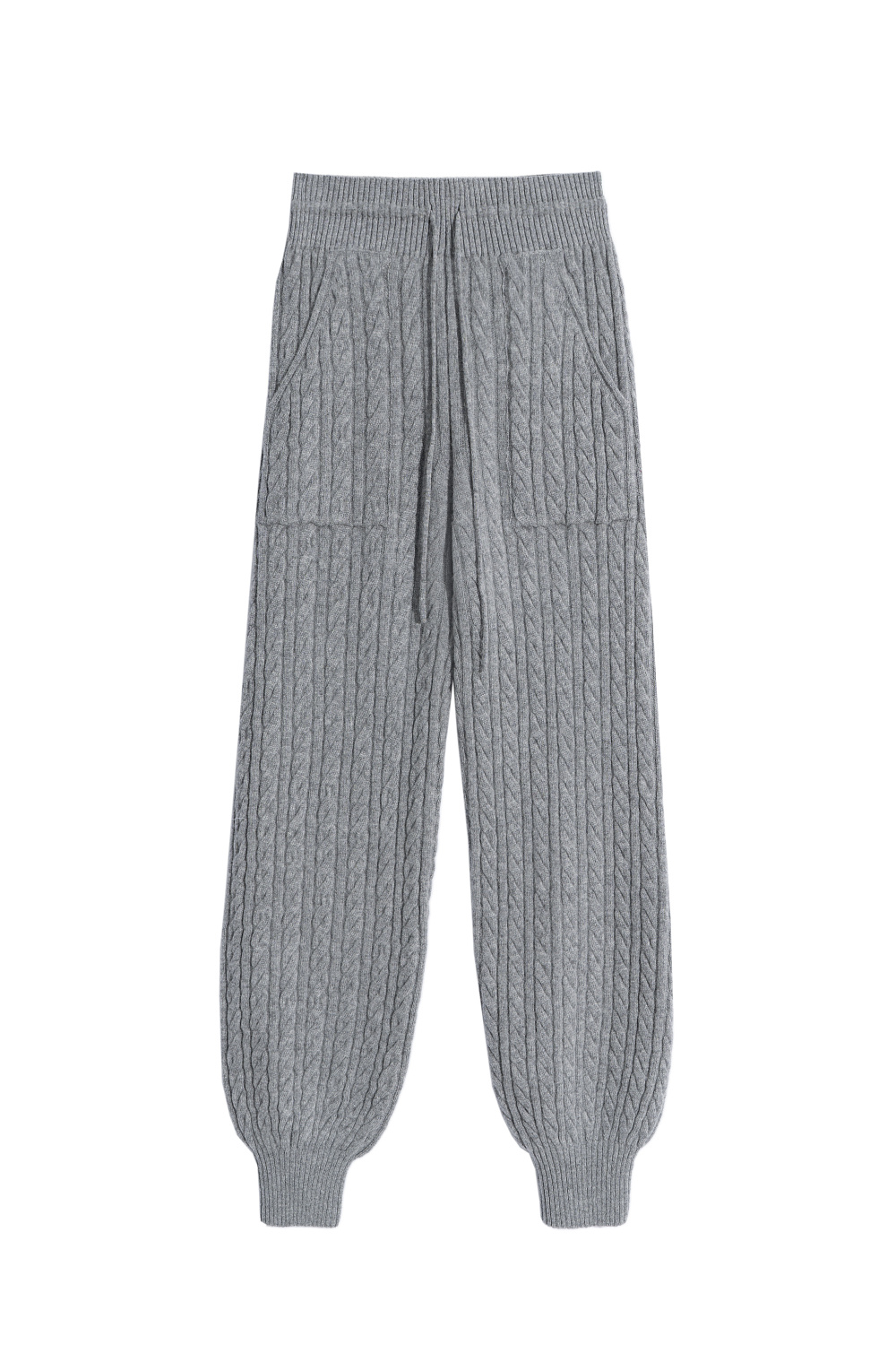 Cashmere and wool knitted joggers with voluminous cables. Features an elastic waistband, large patch pockets and ribbed cuffs.