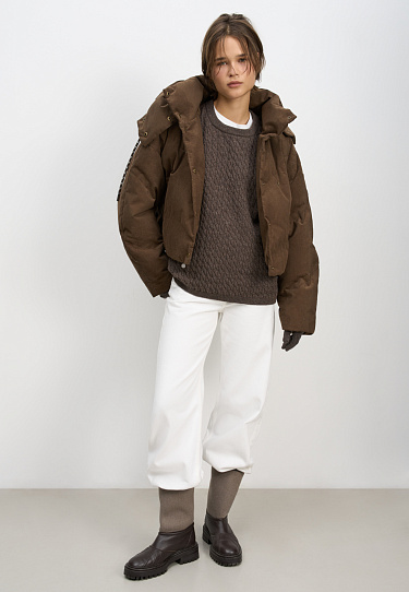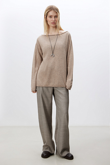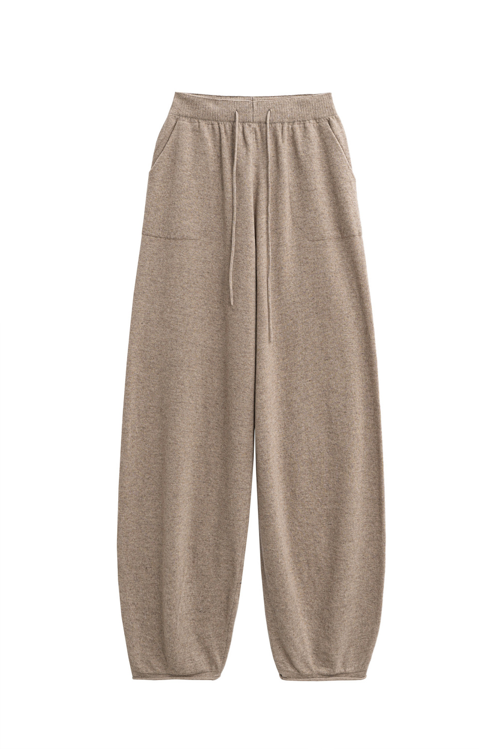 Knitted banana trousers made of cashmere and wool. Model with an elastic waist, complemented by a drawstring, large patch pockets and rolled cuffs.