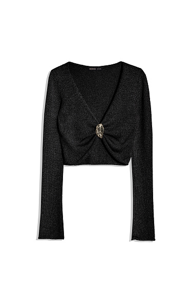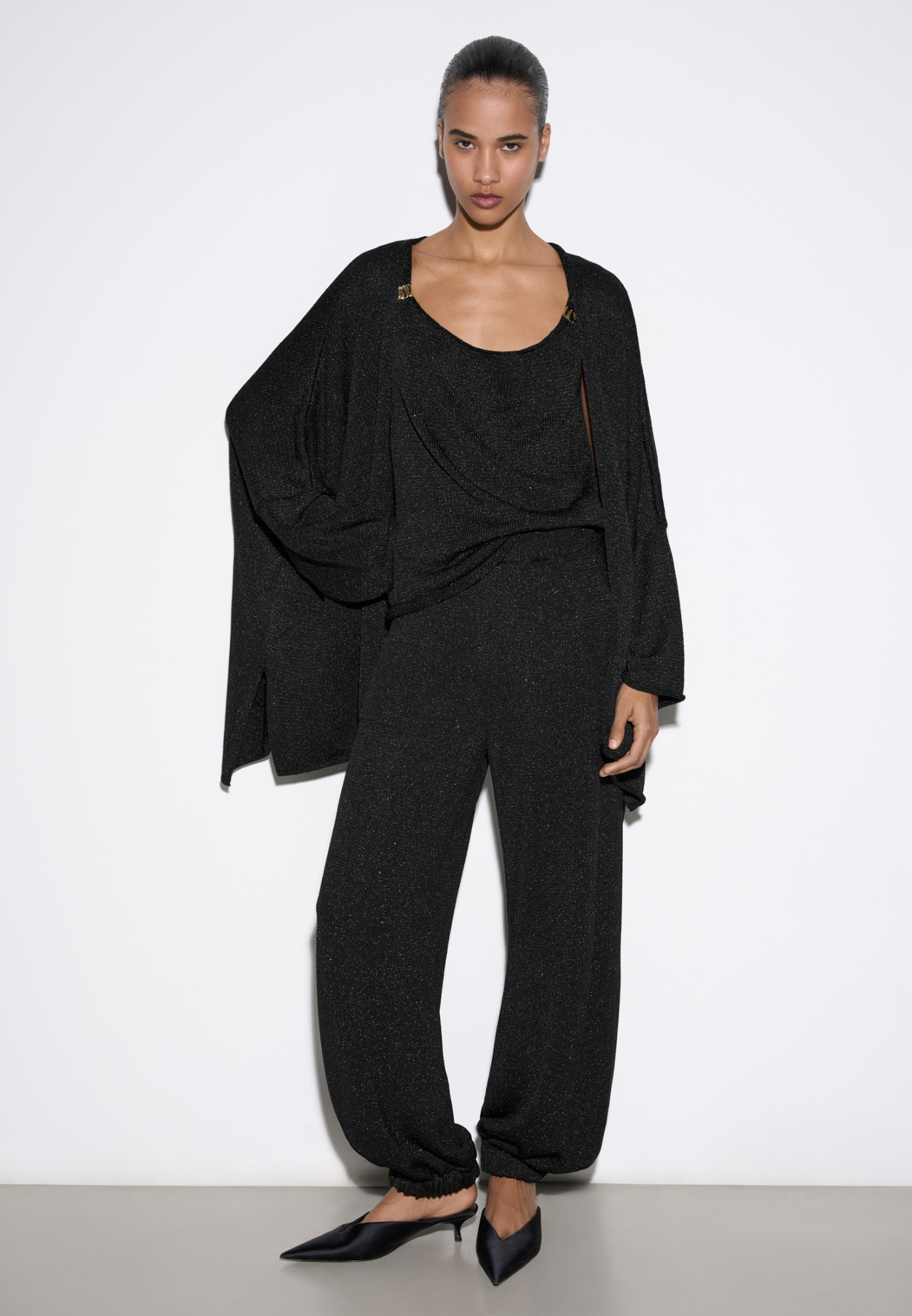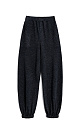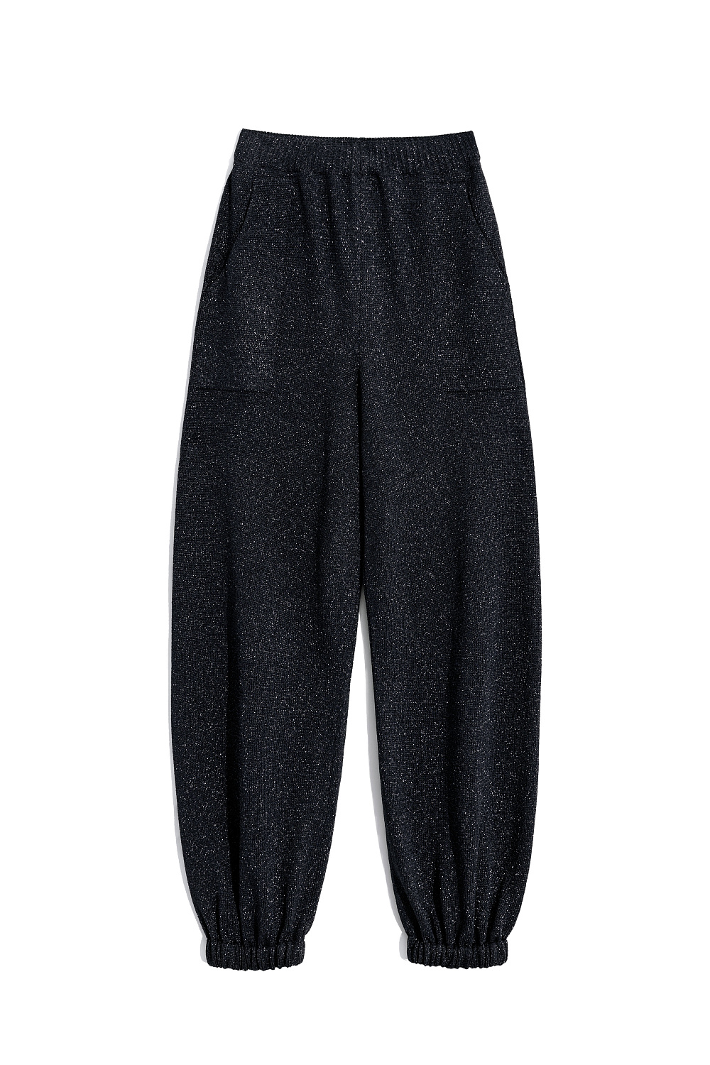 Knitted jogging trousers made of viscose with the addition of lurex. Model with an elastic waistband with a drawstring, side pockets and elasticated cuffs.