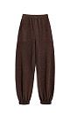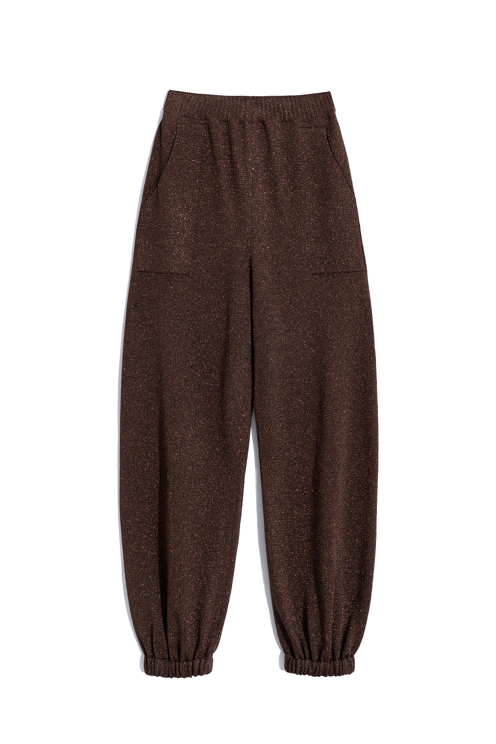 Knitted jogging trousers made of viscose with the addition of lurex. Model with an elastic waistband with a drawstring, side pockets and elasticated cuffs.