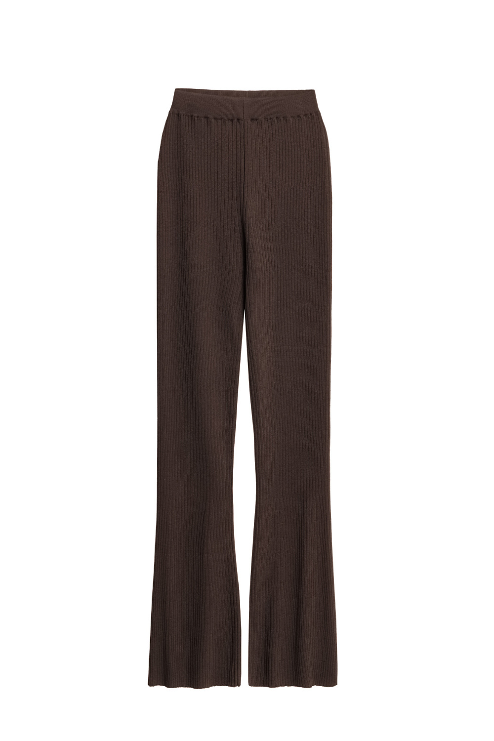 Knitted flared trousers made of ribbed viscose. Straight cut model with flared bottom. The product is made with an elastic waistband.