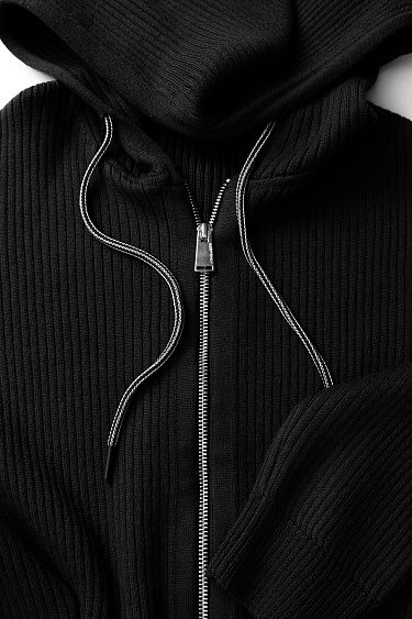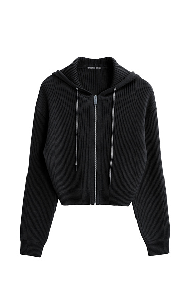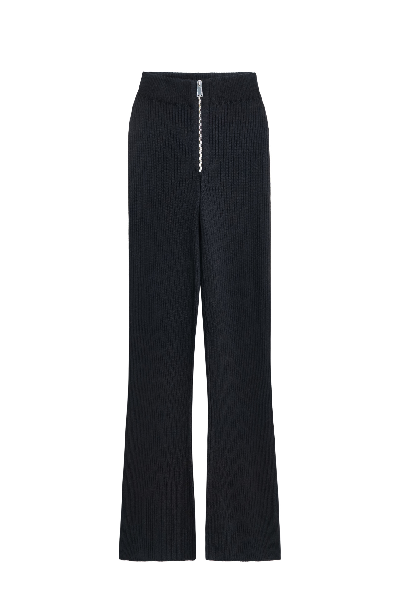 Ribbed knit trousers. Straight cut model with flare at the bottom. Zip closure. Elastic waistband.