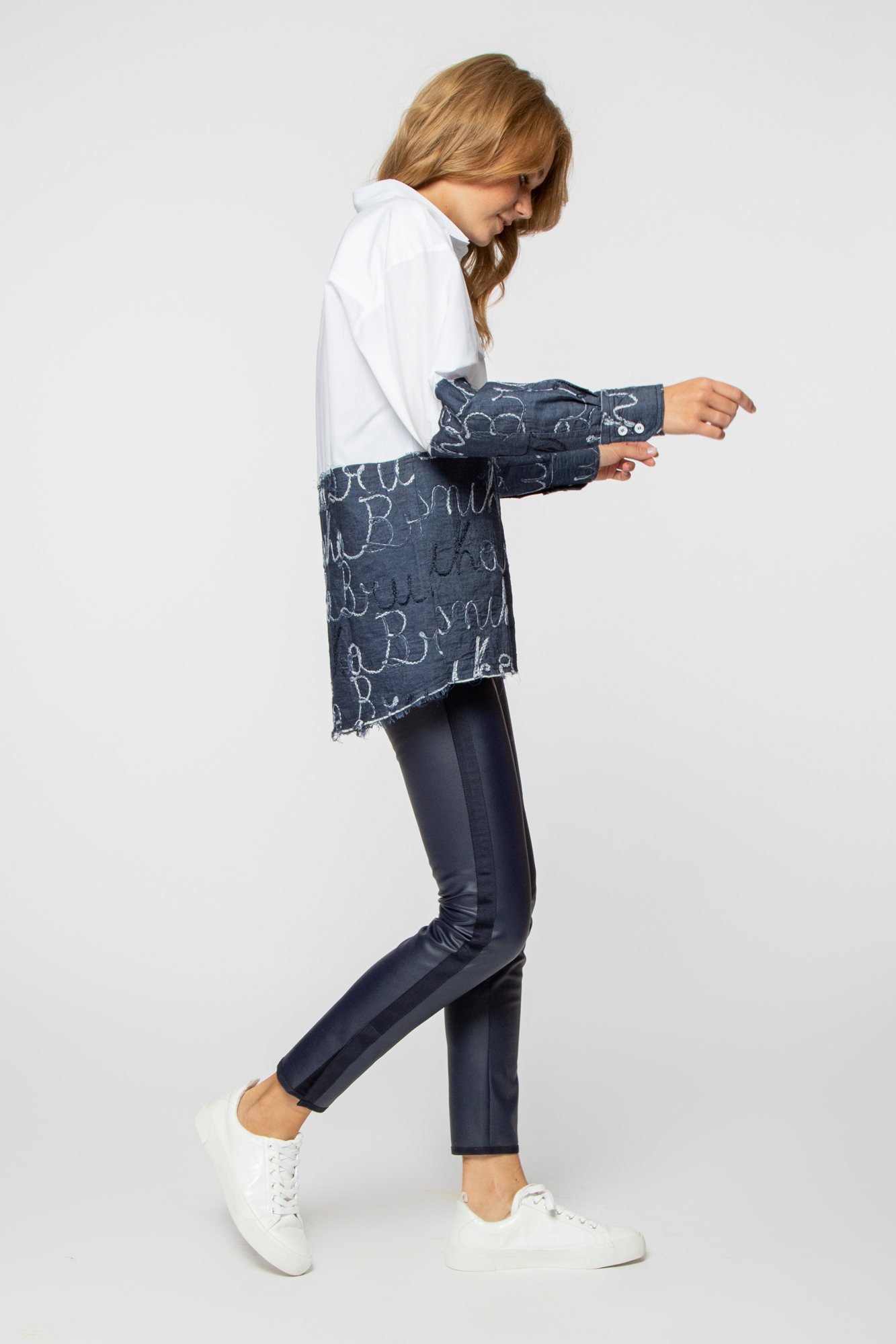 Cropped leggings made of eco-leather. There are stripes on the sides. There are small slits at the bottom.