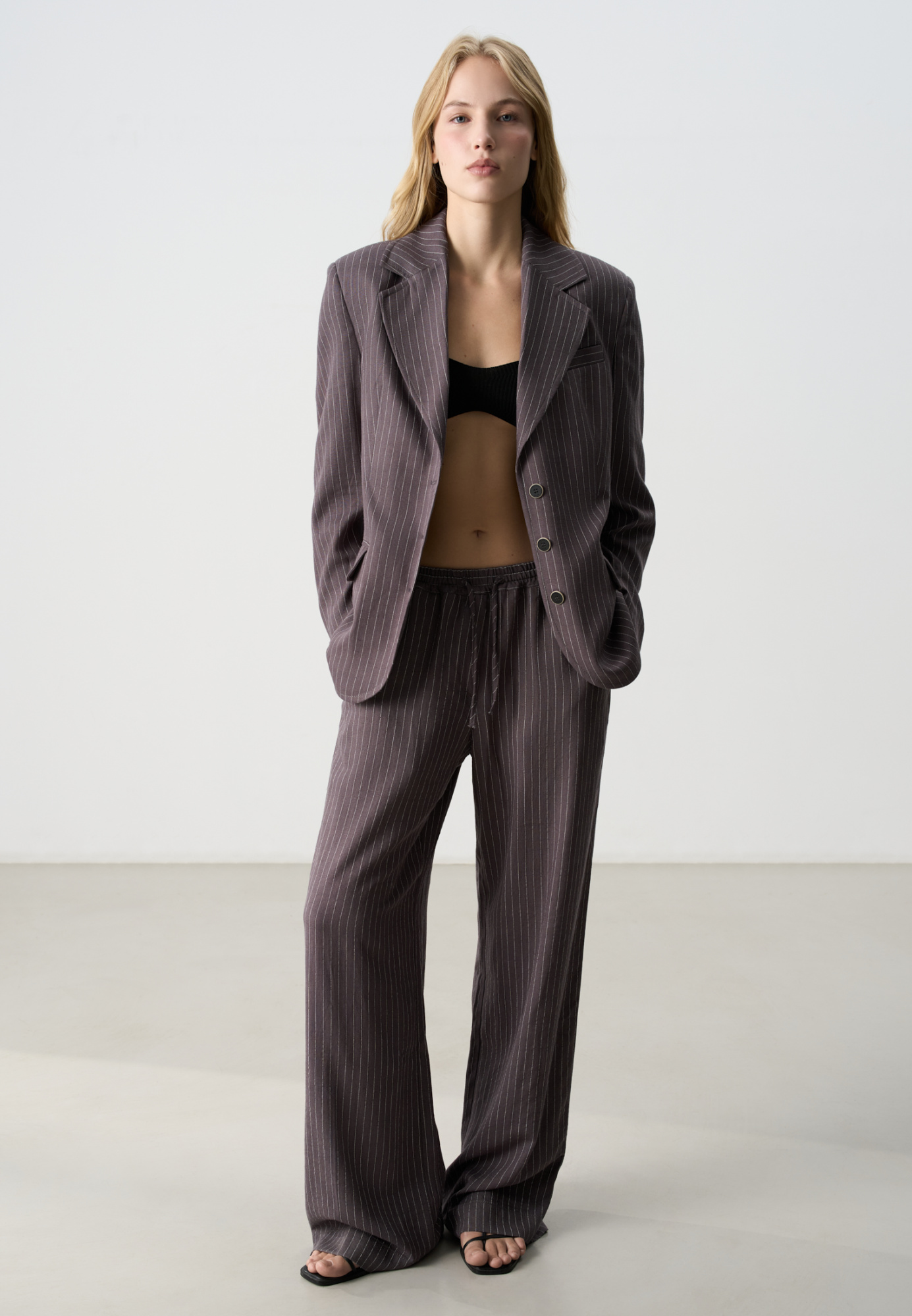 Striped trousers made of linen with added viscose. The model has a straight cut, with an elastic waistband with a drawstring. You can complement the look with a jacket.