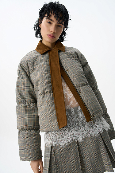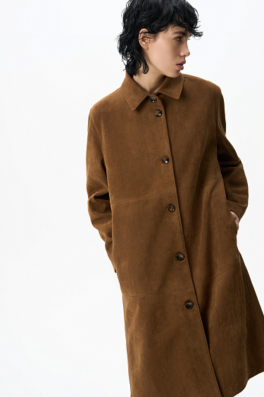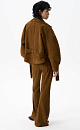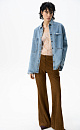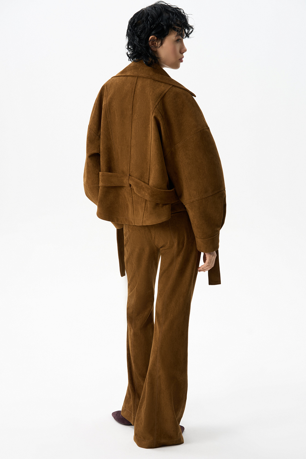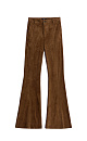 Flared trousers made of fabric with an imitation of the appearance and properties of natural suede. Model with belt loops, side pockets and arrows. Button and zip fastening. Finished with tone-on-tone stitching.