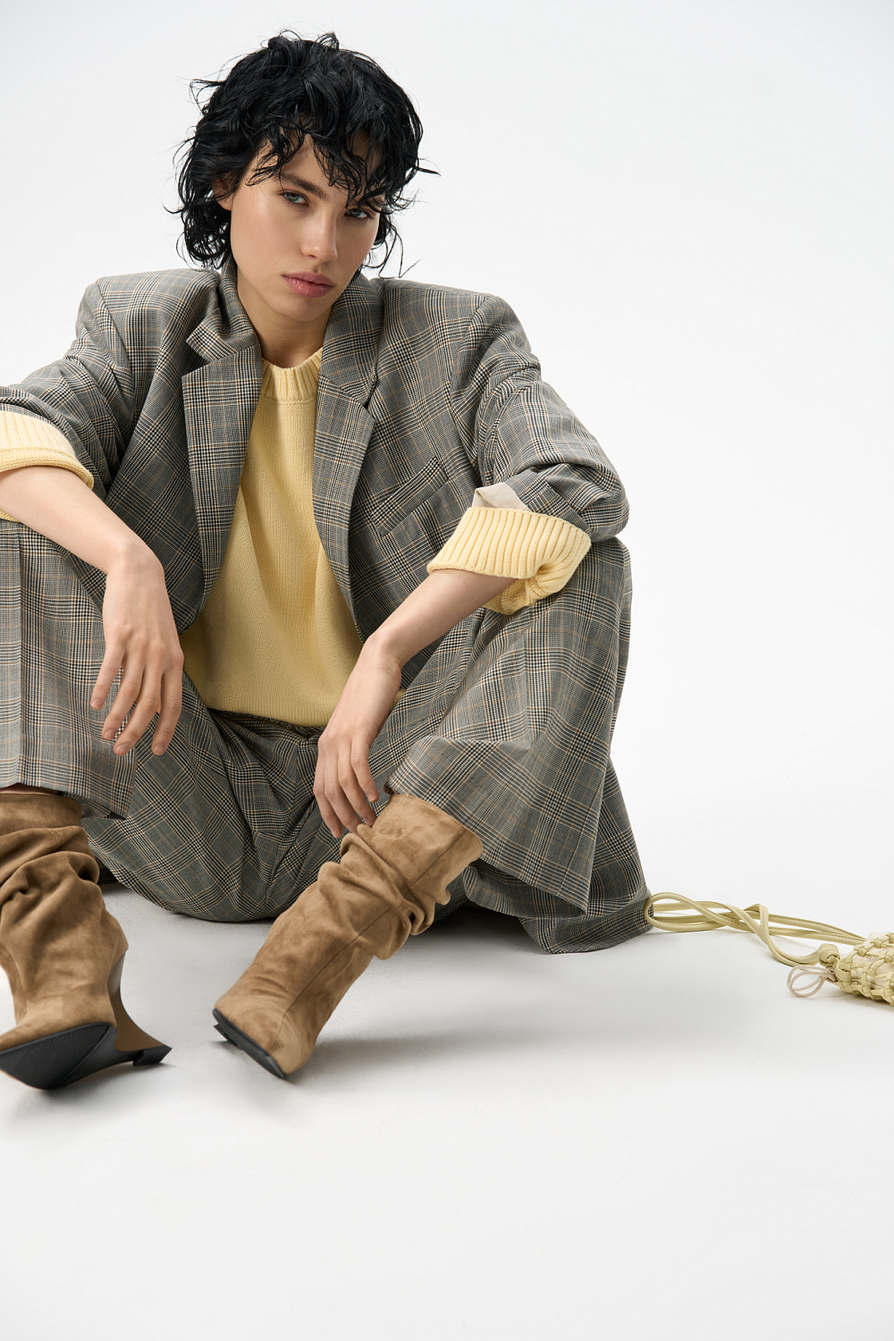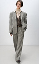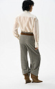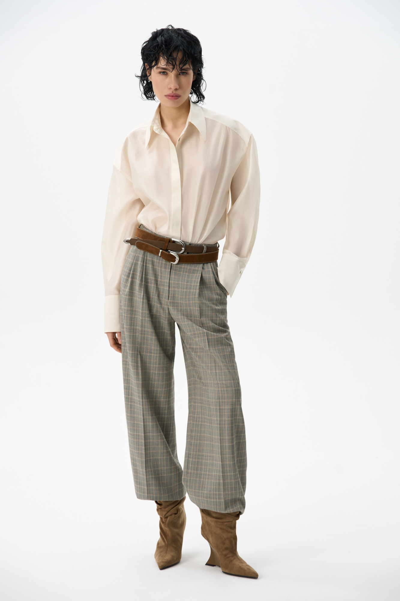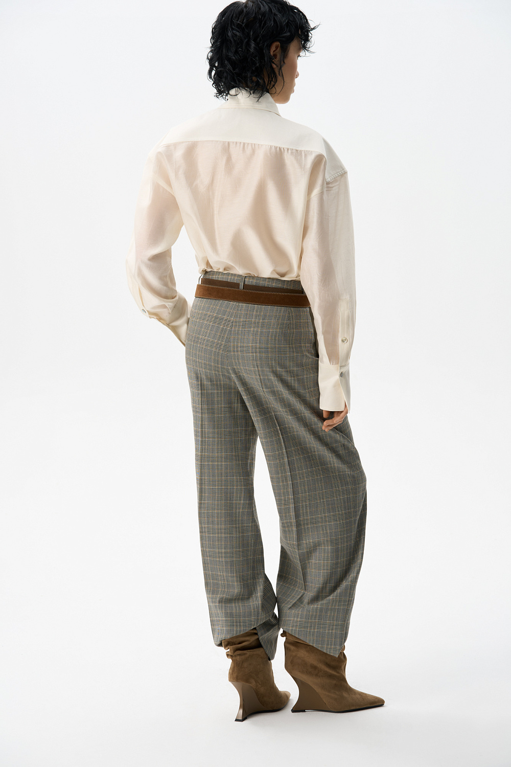 Glencheck wool trousers. Straight cut model with pintucks at the waist, belt loops and pockets. Zip and button closure.