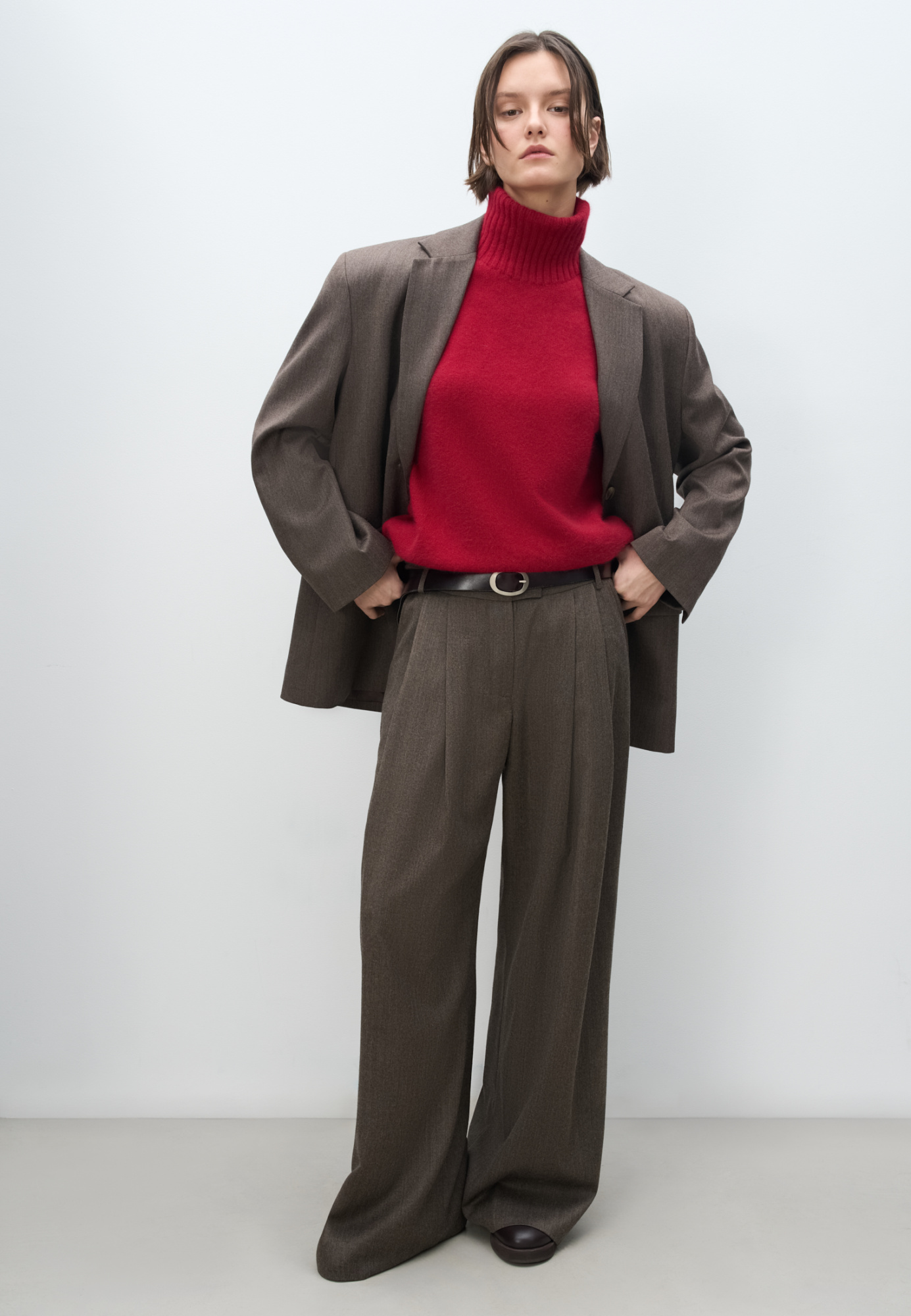 Flannel palazzo pants. The model has a straight, loose silhouette, with side and back pockets. Belt loops on the waistband. Fastening with a zipper, hidden button and trouser hook.