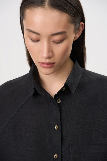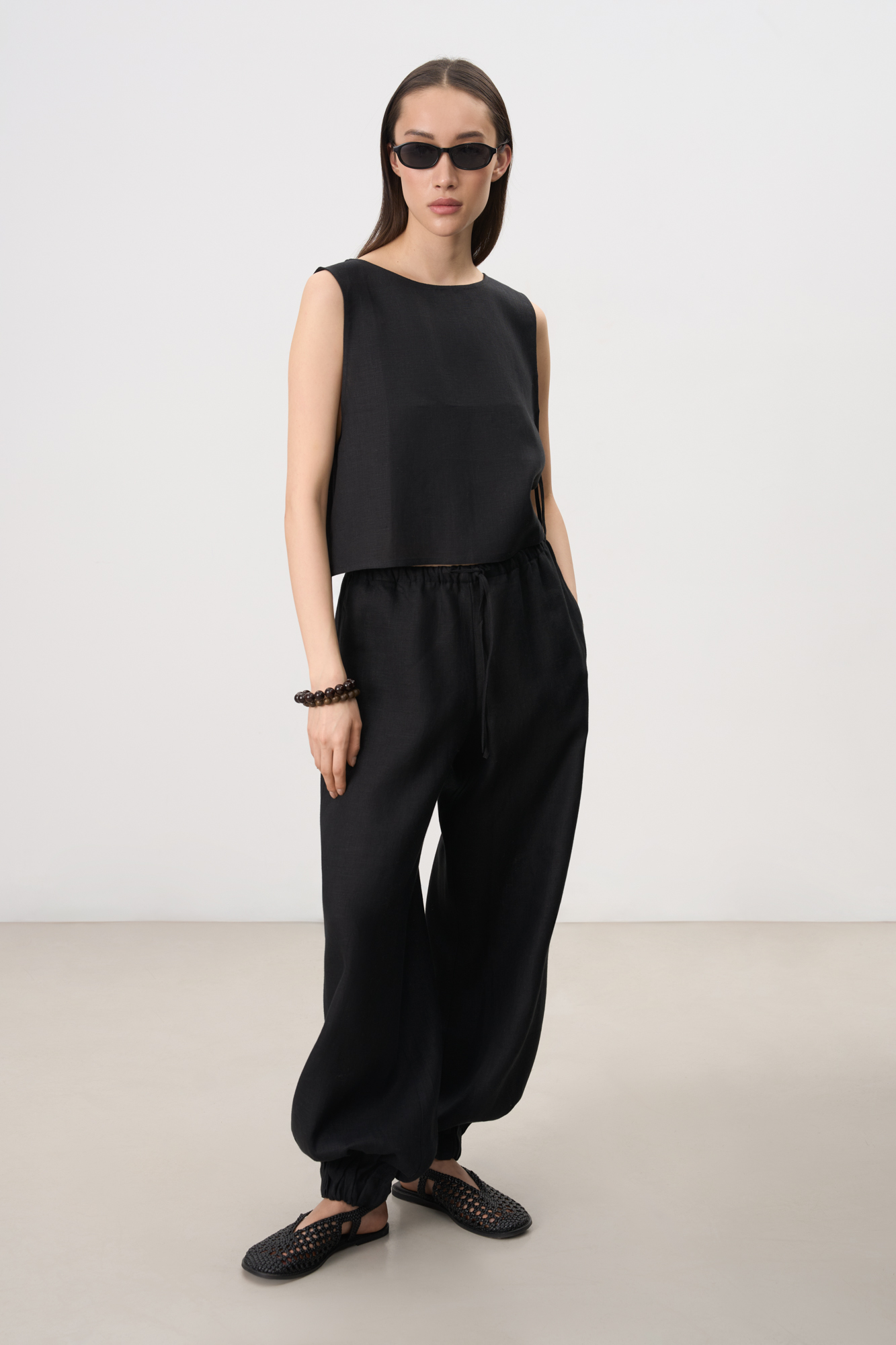 Jogger trousers made of 100% linen. The model has a loose silhouette, with an elastic waistband with a drawstring and elasticated cuffs.