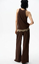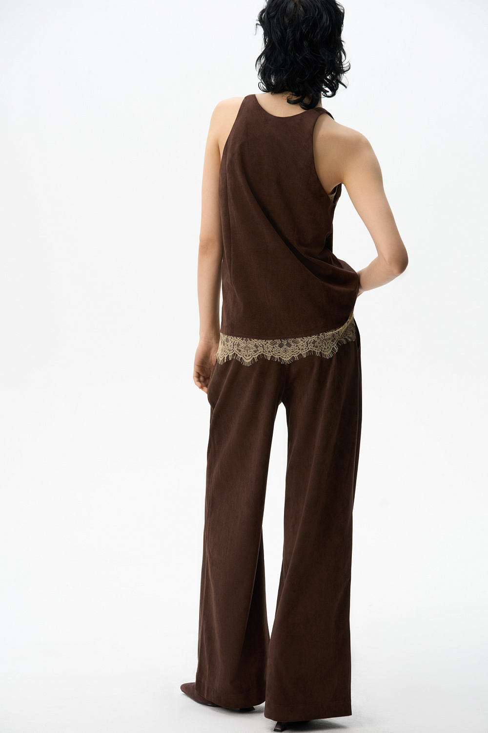 Trousers made of fabric with an imitation of the appearance and properties of natural suede. Model with pintucks at the waist and belt loops on the waistband. Fastening with hidden button and trouser hook. Finished with tone-on-tone stitching.