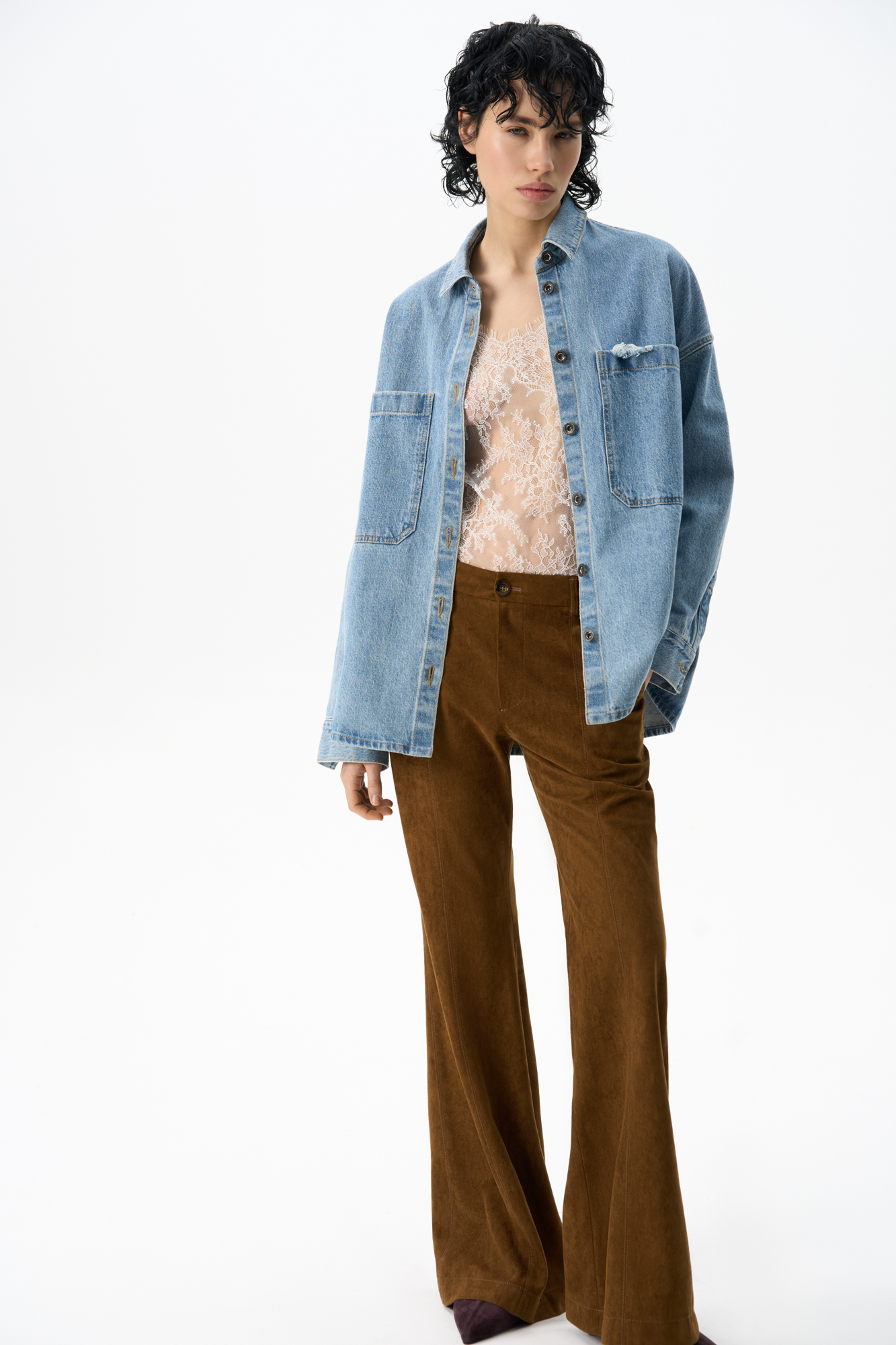 Flared trousers made of fabric with an imitation of the appearance and properties of natural suede. Model with belt loops, side pockets and arrows. Button and zip fastening. Finished with tone-on-tone stitching.
