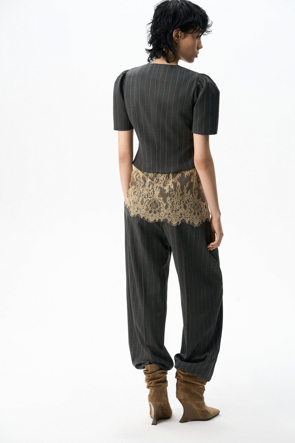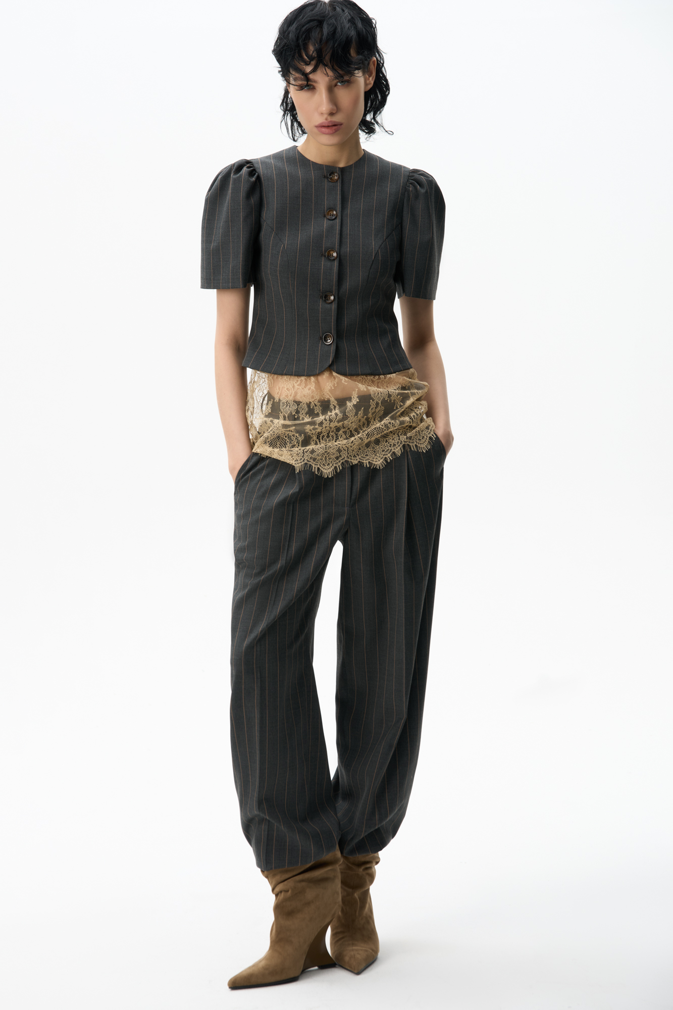 Straight wool trousers. Model with pintucks at the waist, belt loops and pockets. Zip, hook and hidden button closure.