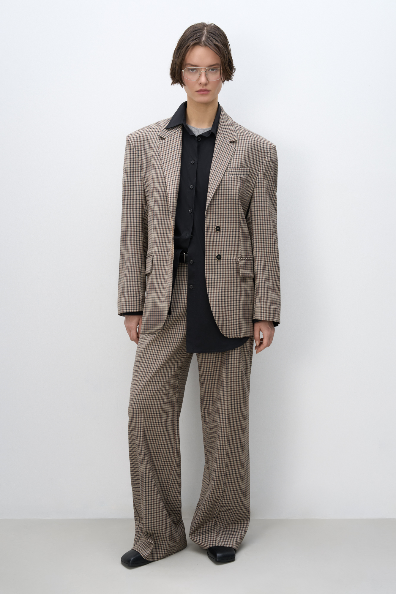 Vichy wool trousers. Straight cut model with pintucks at the waist, belt loops and pockets. Zip and button closure.