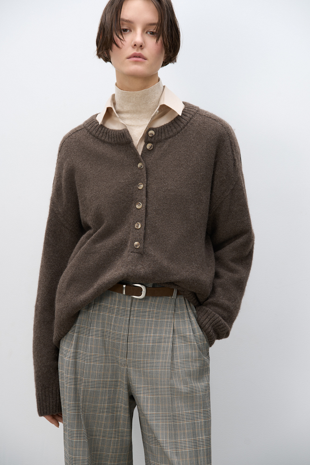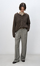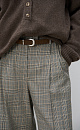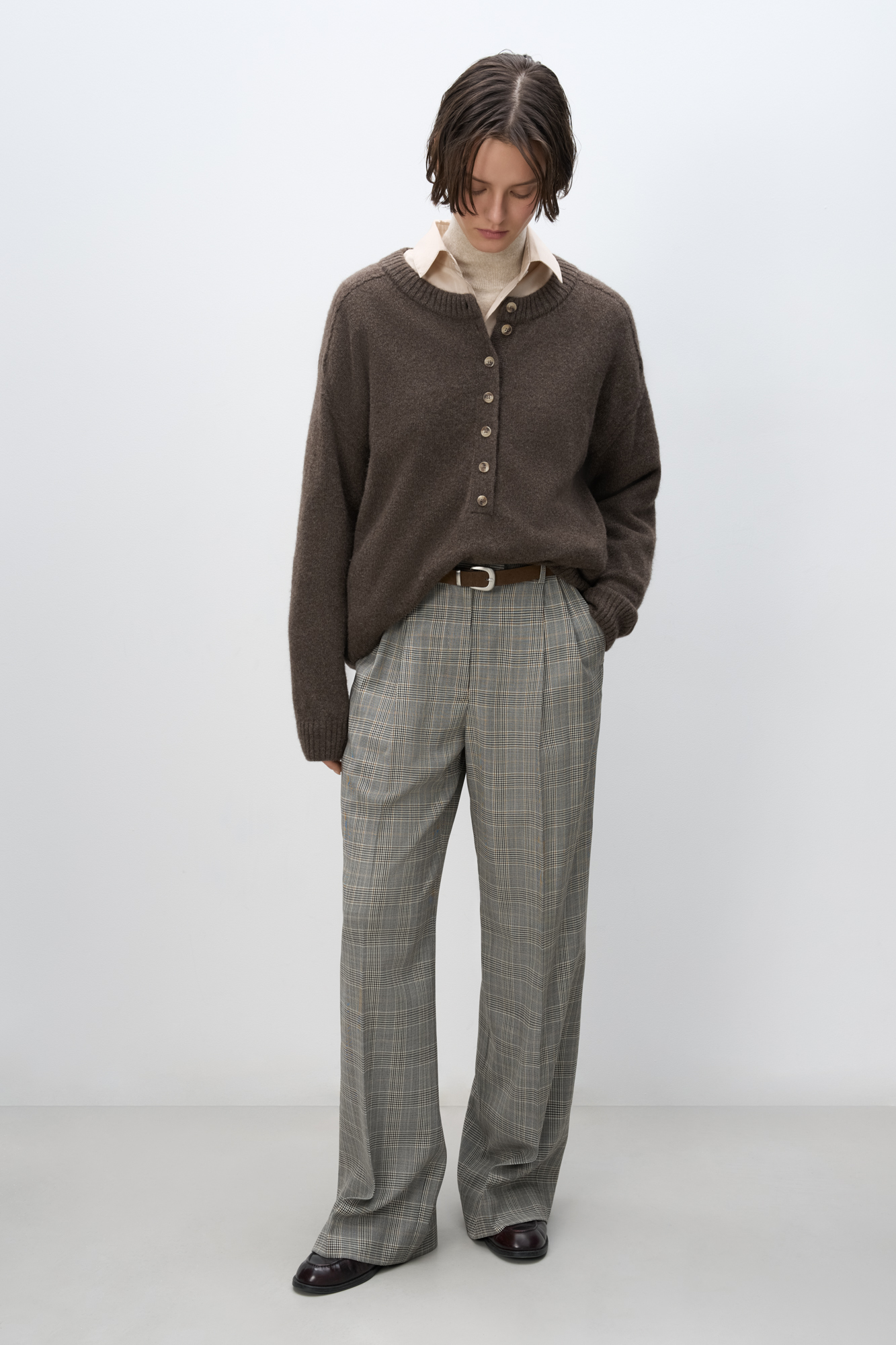 Glencheck wool trousers. Straight cut model with pintucks at the waist, belt loops and pockets. Zip and button closure.