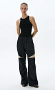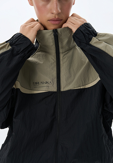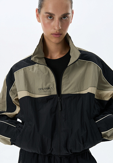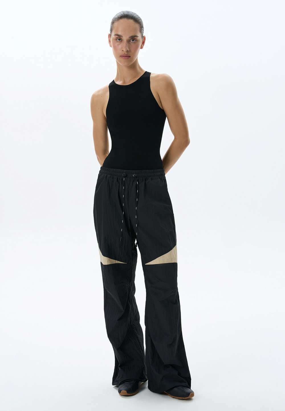 Sports trousers made of 100% nylon. The model has a loose silhouette, with a wide elastic waistband with an elastic band, complemented by a drawstring. The product is decorated with contrasting inserts. You can complement the look with an sweatshirt in the same style.