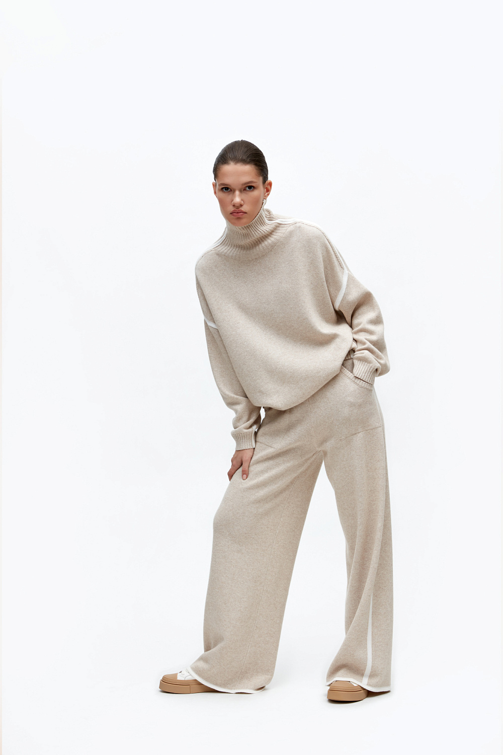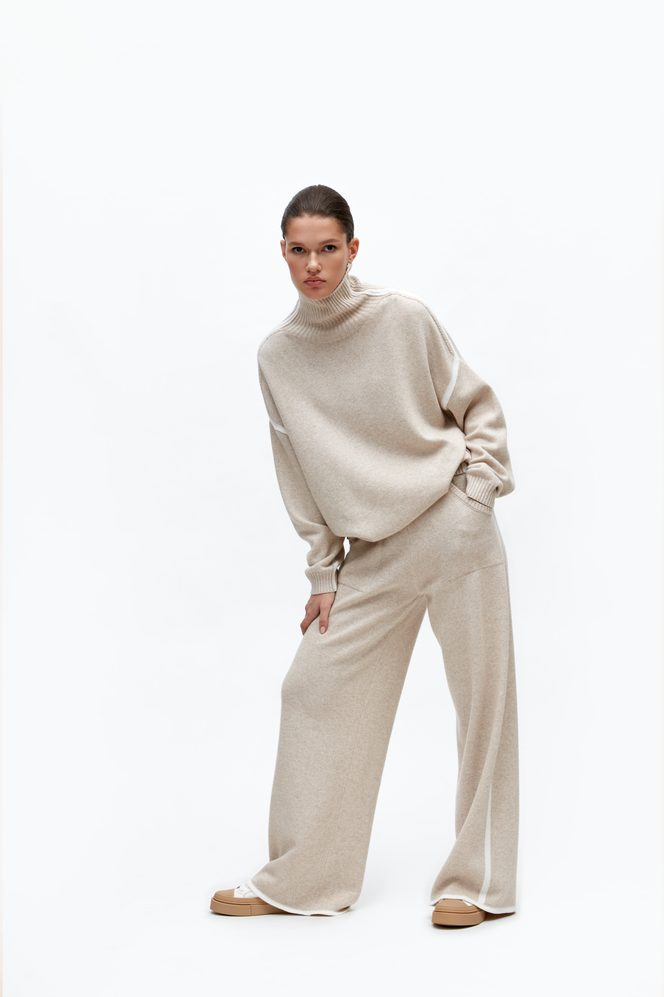 Wide trousers with contrasting stripes. A wide razinka belt. Side pockets.